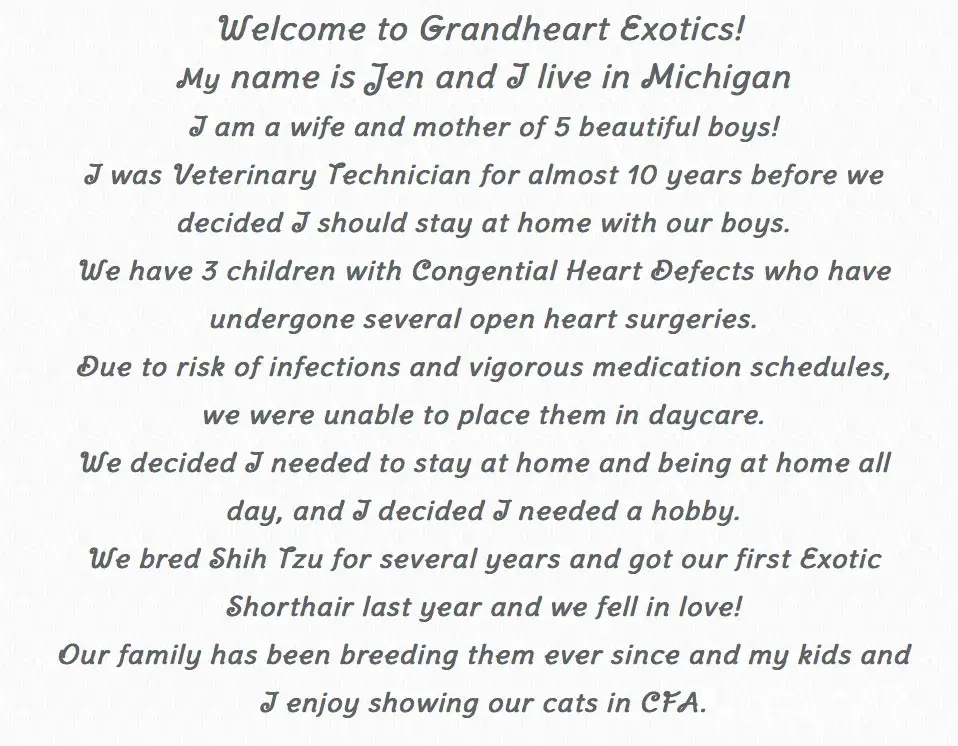 Also, in the forum linked above, Jen V denies that she is not the cattery owner of Grandheart Exotics. She says she is a Veterinary Technician, and she buys, and sells kittens. What a coincident that Jen V and the cattery owner of Grandheart exotics are BOTH friends of Anastasia, BOTH involved in the same forum, BOTH named Jen V, are BOTH Veterinary Technicians, and BOTH breed kittens? Attached are screenshots of what I found on the Grandheart Exotic Cattery's website and the forum I linked above.