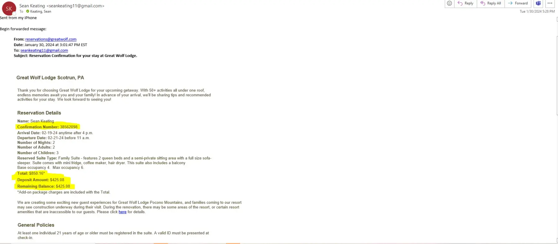 Friday Jan 12- Sunday Jan 14. My reservation number is [protected] with a total of $1,131.22 a deposit of $283.92 was withdrawn from my account on Jan 10 and the remaining balance of $847.30 was charged upon checkin. I arrived with my three sons and checked in a few minutes after 8pm on Friday Jan 12. I went to the room to drop our bags and then we went to...