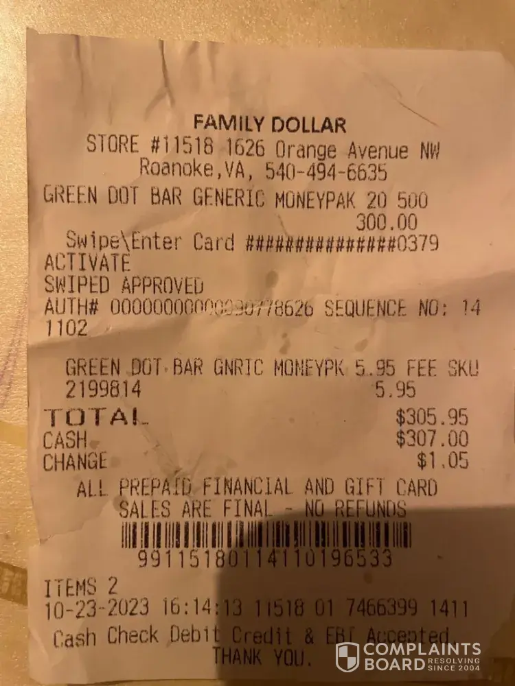 Family Dollar Store where I purchased the card said they could not help me, the Better Business Bureau stated they could not help me and told me to contact the Federal Consumer Division.