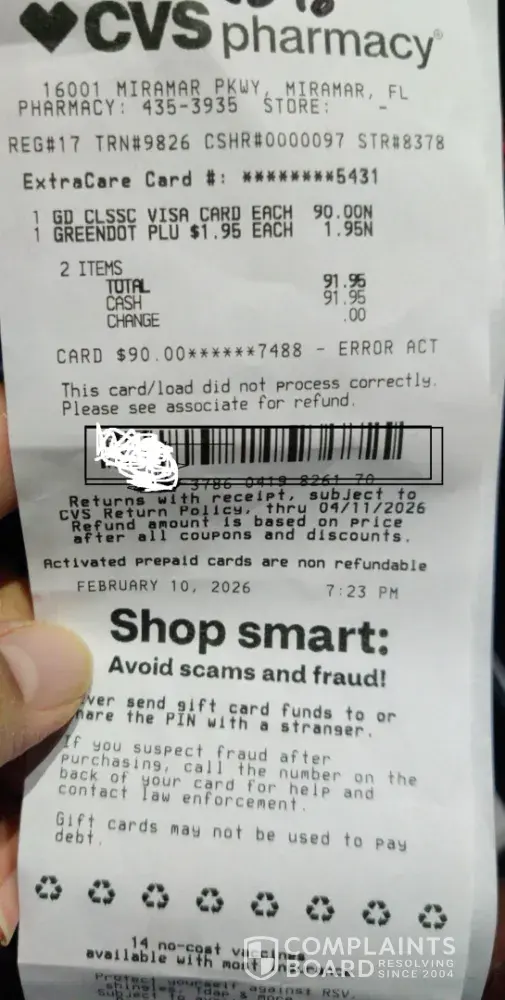 I attempted to load my card at a CVS self-checkout on 2/10/2026, but the transaction resulted in an error. The CVS cashier and manager were unable to issue a refund and instead provided a toll-free customer service number to call. That same day, customer support asked me to email my receipt, which I did immediately. As of today, 2/19/2026, I still have not...