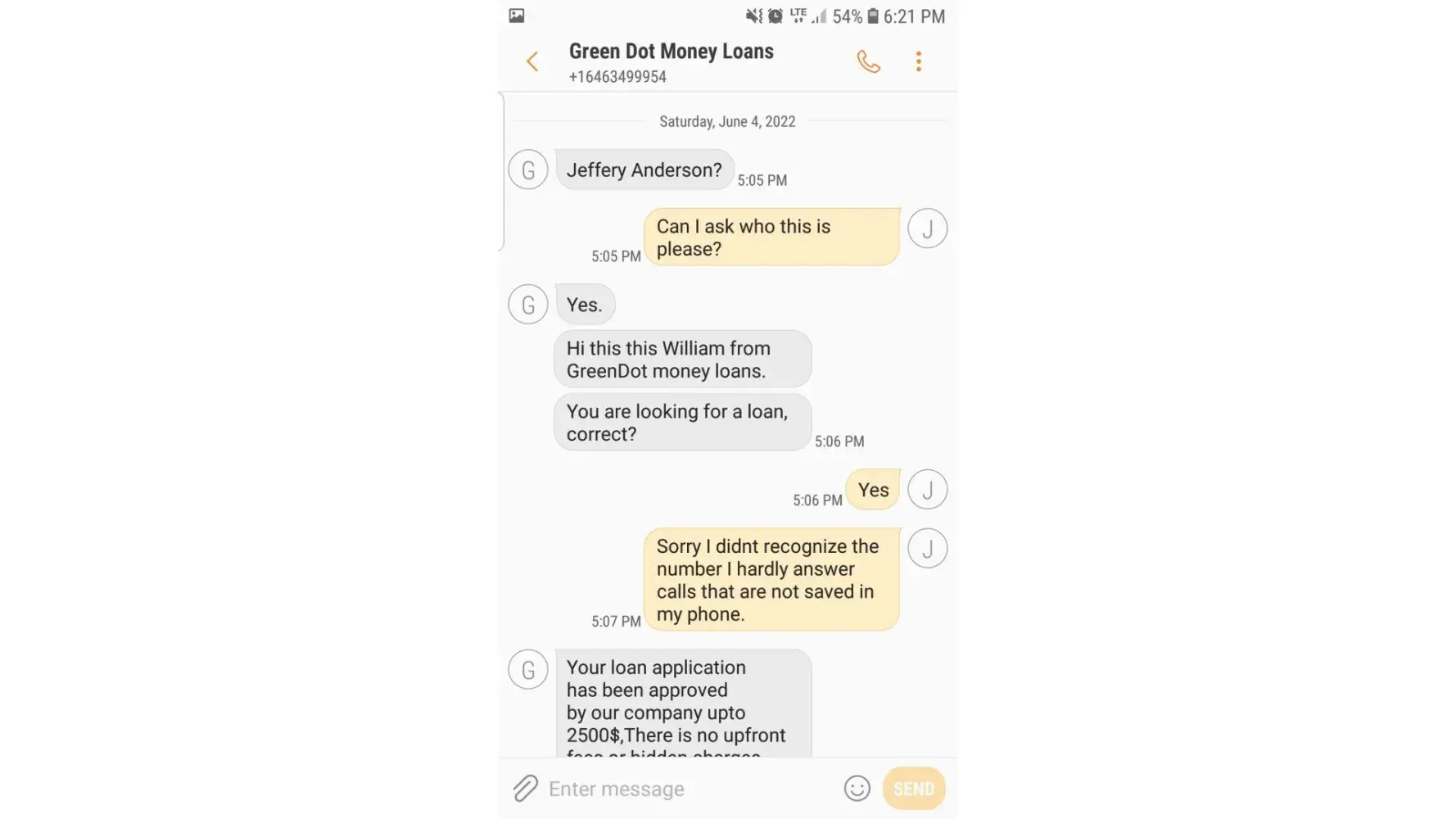 Okay so I'm feeling this out for a second time because I want to go upload pictures and proof that I had and also knew it was an error so basically again I got a phone call from Green Dot money loans I didn't answer it then I proceeded to get a text message from the same number and said Jeffrey Anderson? I proceeded to and there's a yes I said can I ask who this is he said he was William with Green Dot money loans and I have been approved for a loan for $2,500 and asked if he could call me I said yes I'm available to talk and he called me on the phone 10 minutes tops said that I was approved for a loan for $2,500 I just needed a green. Issued bank debit card or account and he was going to verify my bank call me back in 30 minutes and the funds would be deposited by 10 tonight. That was all wrong he took all my information it's been over an hour I called that number back and the number was out of service. I tried to contact the Green Dot Bank itself through bi-tapp I got no help anywhere the virtual assistant said pre login help and I still didn't even get free login help I was told I had to log in to my account did I have a Green Dot and then they would catch me about my problem. The last agent told me to call the 1866 number and press option 6 I did and there is no option 6 it's 1 2 or 3. So I tried contacting a couple people through HR Green Dot bank got nowhere. So I decided to do some research to take it upon myself to do some research and I found out everything I need to know about the company with the c e o s who owns it what their Titleist for the company the whole nine yards. Their stocks how much they sell how much every person is worth I have it all. So my question is to Green. Green Dot money loans if there is such a thing why is this William calling from this number it's a 646 area code and using you guys saying he's loan officer from Green. And he's not even American. So when I found that list of everybody that's Affiliated or owns Green Dot bank I found three different Williams and funny thing is they're all American 40 / and I live in California Zephyr I think 1. So that being said I'm going to contact the lawyer and see without come or what my attorney thinks I can do about this because now not only did this William Green Dot money loans Slater Green Dots name I was lied to humiliated my personal information was taken and I got nothing. But times being tough nowadays I really needed that loan I needed to get a car to get back and forth to work and they got my hopes up for no reason so I'm going to repost evidence that I have hopefully it doesn't say I say loading error this time and see what happens.