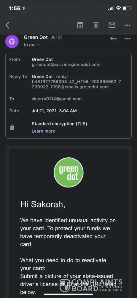 I'm so stressed because I commute to and from work and will have to be onsite next week. So not only will I be without my vehicle but me paying rent on time and probably charged a late fee. I went ahead and filed a BBB complaint and following up with the Federal Reserve on Monday. I also filed another complaint with ConsumerFraudLegalServices but also contact my attorneys office. This is disgusting and my gut feeling is telling me that the process is going to take more than 2 business days. My concern again is why not send an email back to customer's that the documents has been received and state in the autoreply that it can take up to two business days to receive an answer? It's that simple! Green Dot hire so many foreign people that it's sometimes hard to understand what they're saying over the phone. Thank goodness I recorded my phone calls today as evidence because I'm going to seek legal counsel. Green Dot was never like this in the past, and I did direct deposits with them because I liked the fact that I would receive my money a day or so ahead of time. But to endure this type of headache, anxiety and stress is unwarranted. Now I have to feverishly contact my job on Monday July 26, 2021 to explain the situation and figure out how to stop the direct deposit from coming on July 28, 2021 into my blocked and deactivated account. The sad part is that without customers Green Dot would not be in business. When companies starts to abuse the privileges it's given that hurts the same consumers that keeps them in business is when it really becomes an issue. Hopefully the Federal Reserve will be able to guide me on what else I need to do in this matter on Monday 26, 2021! I need my funds released to me asap, my account reactivated and for the nonsense to be resolved asap!