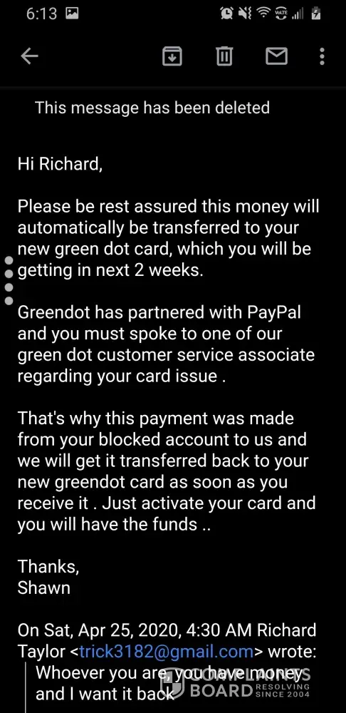 Refill money in a paypal but green dot keep the money and never credit it to my account