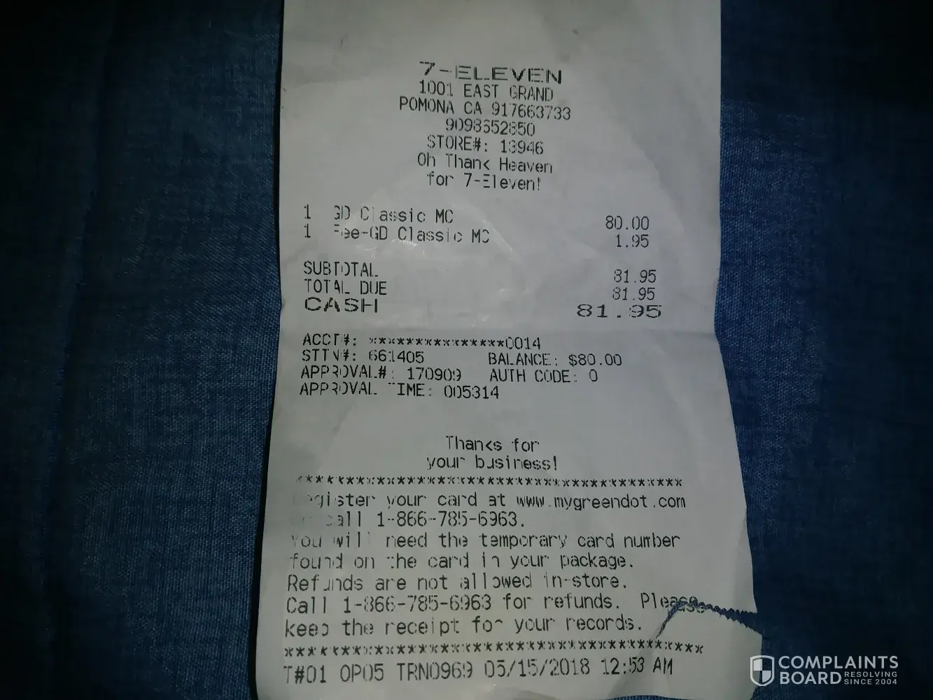 On 5/15/2018 at 12:53a.m. i bought a green dot mastercard at 7 eleven in pomona. I put $80 on card and payed a fee of $1.95 I called customer service to activate card and spoke to somebody to confirm my info. Then i tried to order something online and it said payment declined. So i called customer service to get balance and it said no money on card. The person i talked to also said no money on card