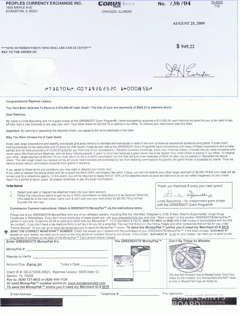The letter states that recipient has been approved for a grant in the amount of $10, 000. The commission to Ms. Ritchie for securing the grant is represented to be 4%, i.e., $400. Ms. Ritchie goes on to tell the recipient to deposit this preliminary check in the amount of $944.55 into his bank account. Then, pay the $400 commission via a commercially available Greendot card to Merchant ID#8549. She states, once that's done the balance of $9, 055.45, which is "waiting in our office" will be sent via overnight air express delivery. Until then the balance of $544.55 is his to spend however he likes, she wrote.