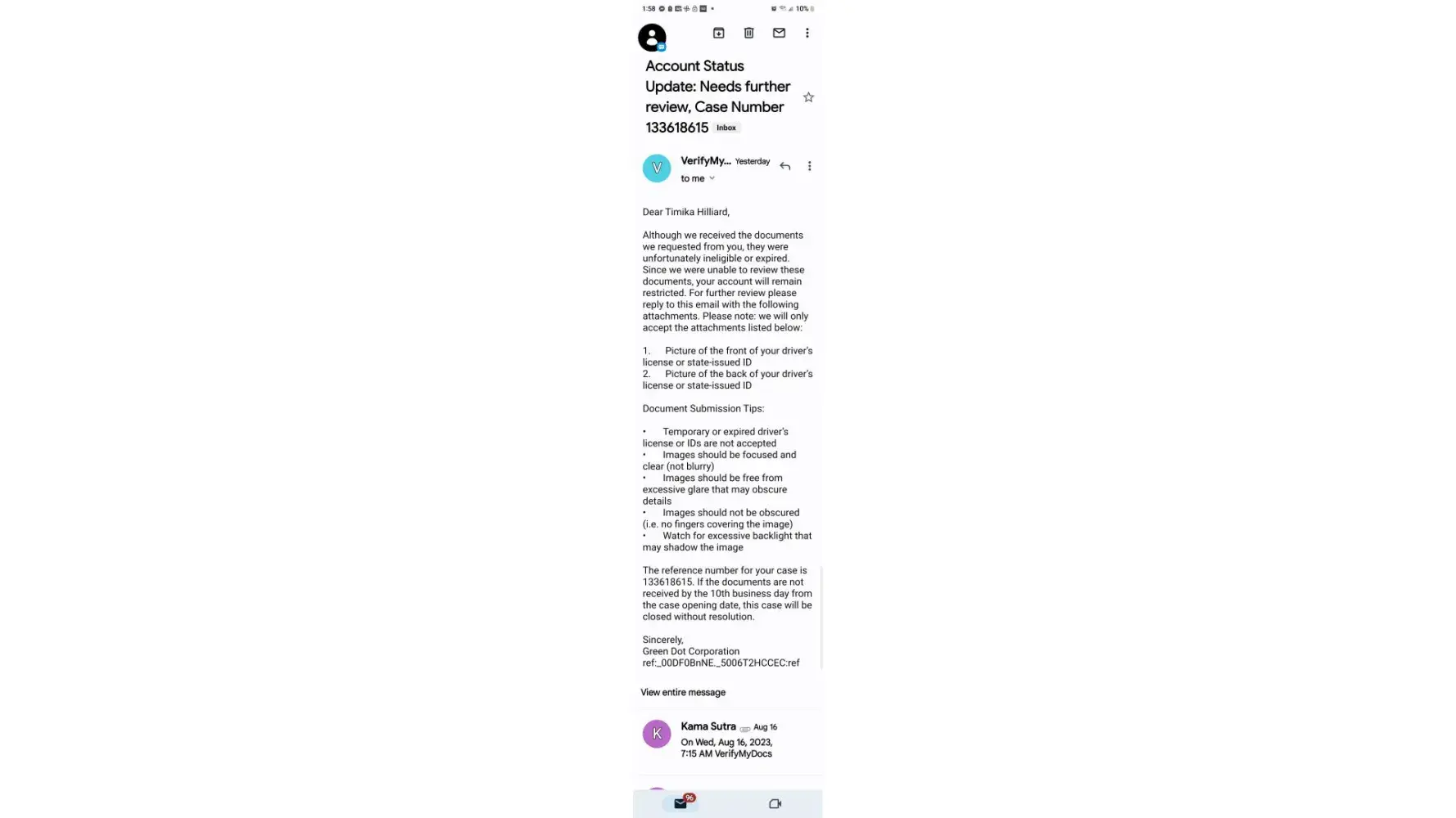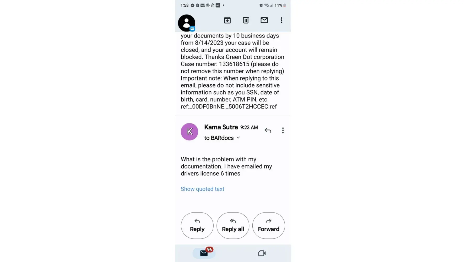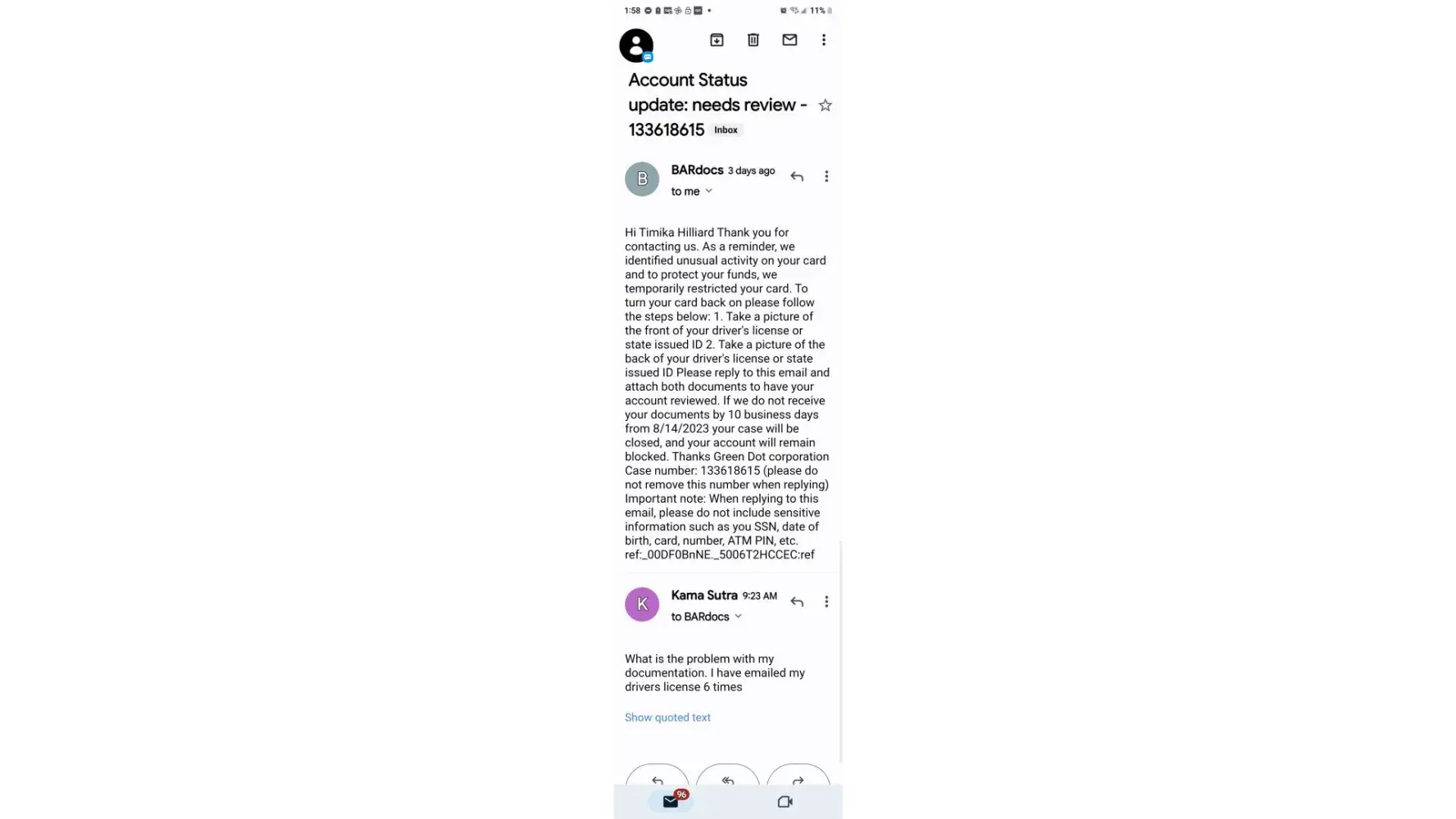 On June 1, 2023 I had my back pay directly deposited into my green dot account, in the amount of 47,000 before I even had a chance to withdrawal anything it was permanently locked. I called green dot where I sent in my ID card and they said they won't accept it as it was a permanent resident card they needed a state ID or Driver's license so I had to go to DNV and get one, after I did that I have mailed in my ID over 10-15x and they keep telling me they are waiting for review. So it's been almost 2 months and my account is still locked I get absolutely no where when I call just the same thing over and over again that it's under review it will be unlocked ked in 2 days I'm told this over and over again, I don't know what to do any advice would be greatly appreciated.