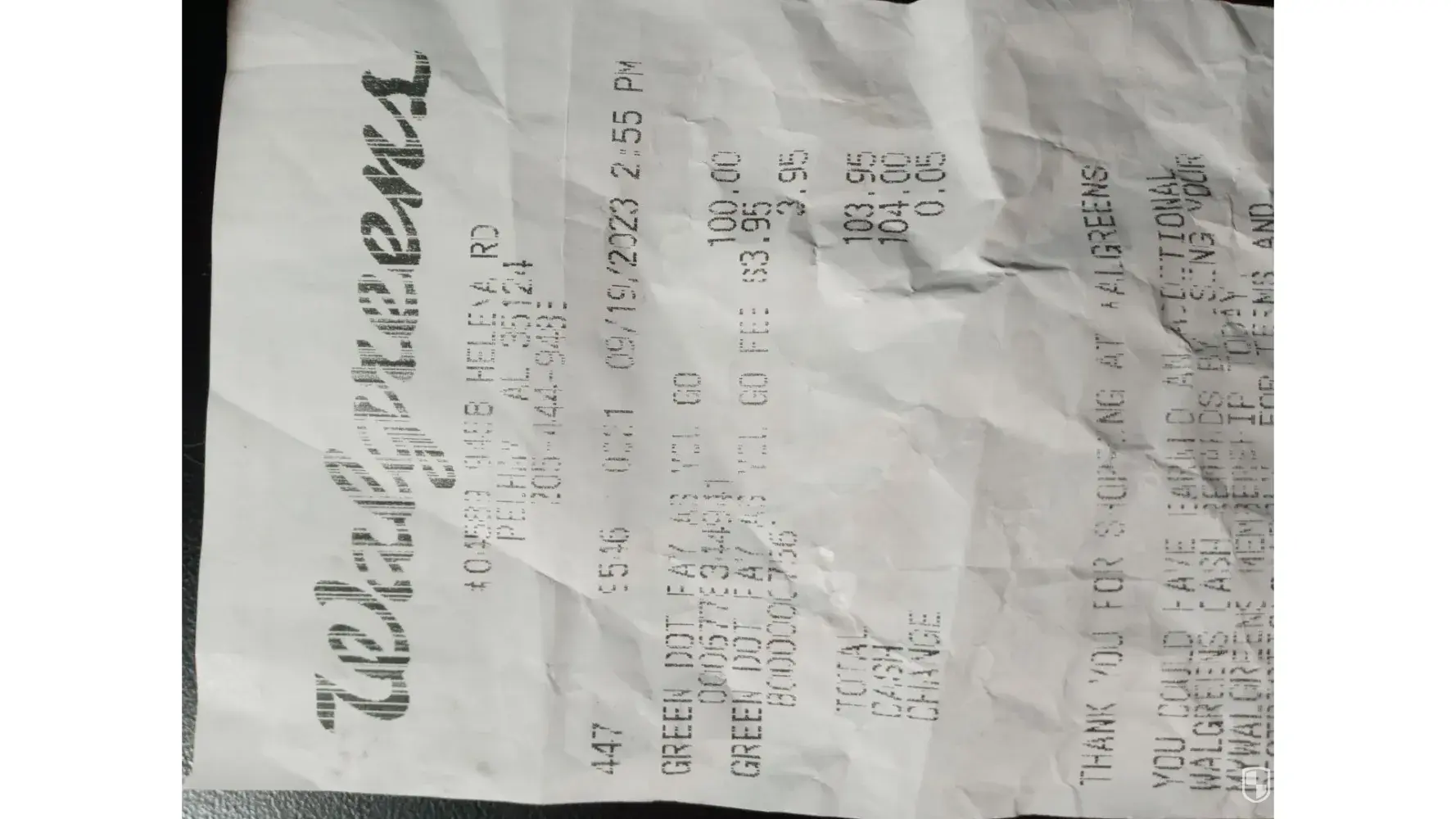 On 9/19/2023 I bought a Green Dot debit Visa pay as you go card, and paid cash from Walgreens located at 9458 Helena Road Pelham Alabama 35124. The time was 2:55 p.m. The advection number is [protected]. the valid through date is 01/25. The cvv is 125. I put $100.00 dollars on the card when I paid for it as you can see from the receipt. I tried many times to register and to activate this card and I am told the card is invalid every time. I called the help line and was told the card was no good. I in good faith bought this card thinking it was good. It is not. At this time, I want either a refund (check) of $103.95, or a new card with my $100.00 dollars on it that is good sent to P.O. Box 1348 Alabaster, Alabama 35007 within the next 7 to 10 business days. I have included copies of the card and receipt.