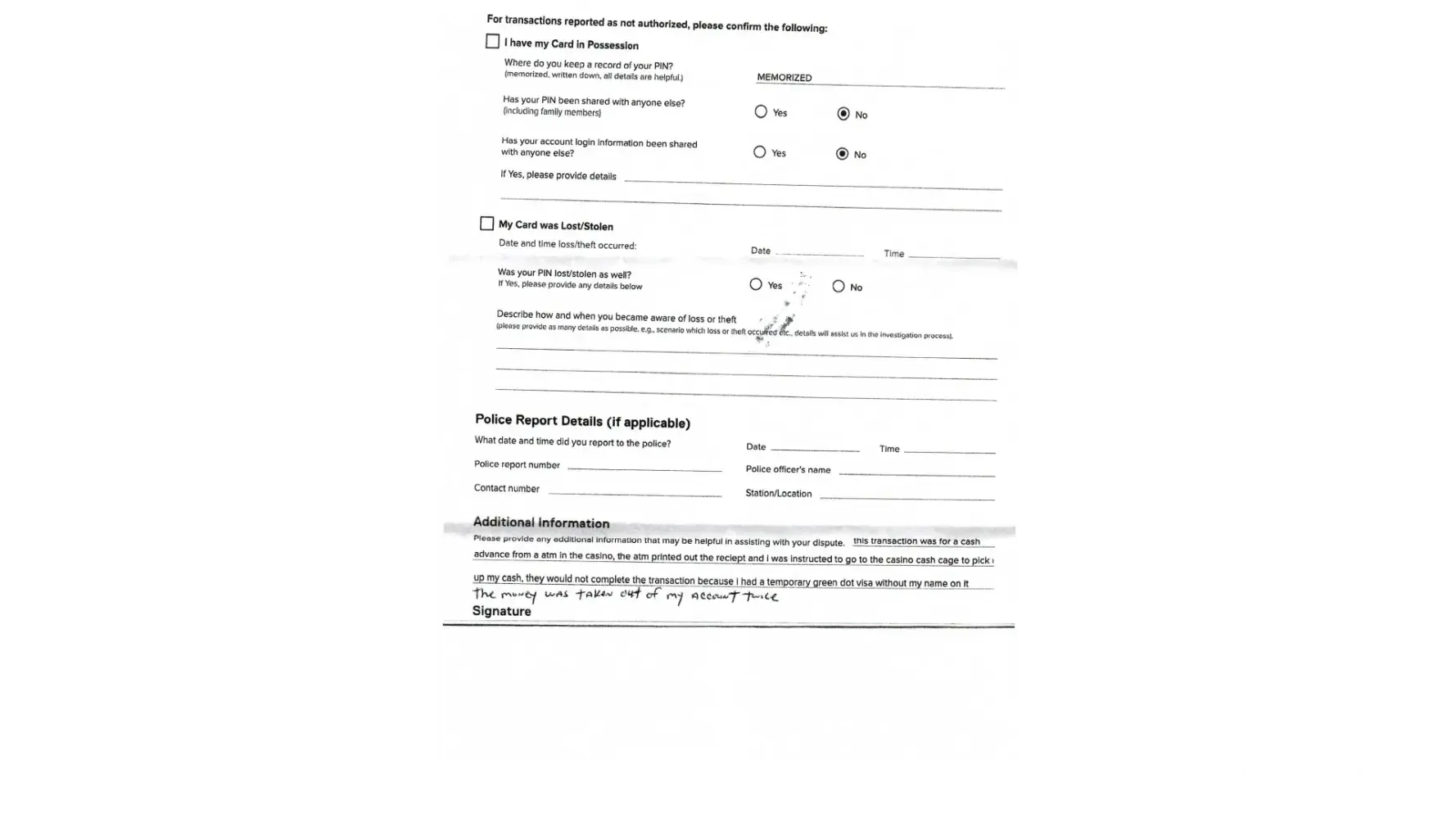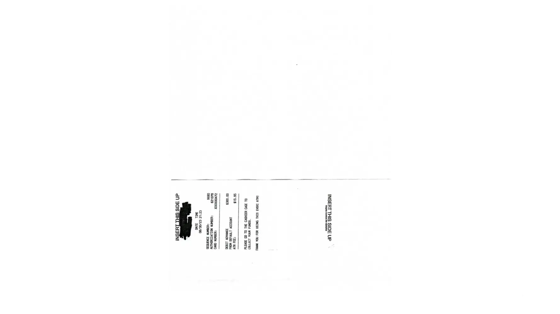 on august 30 2023 i made a atm cash advance transaction at at local casino, the transaction went through the atm machine fine and the atm printed the receipt . this is to be taken to the cashier to be paid in cash.