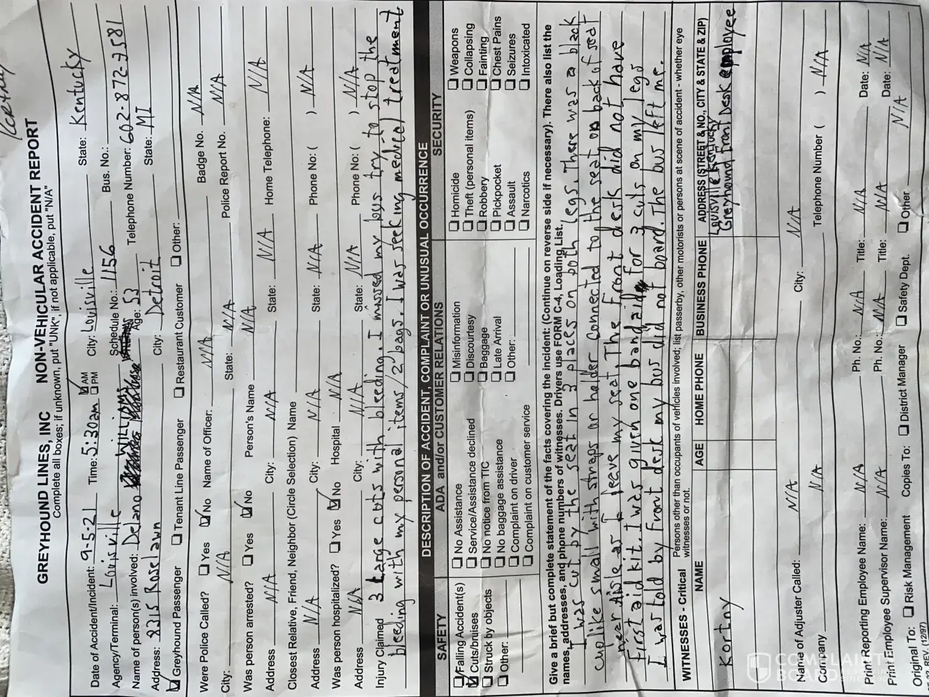 I purchased a roundtrip ticket from Detroit Michigan to Gadsden Alabama to get my belongings to move back to Detroit.September 3 2021-September 5 2021.I was on bus schedule #1156 from Chattanooga Tennessee heading to Louisville Kentucky.It was raining and the bus floor was wet from the rain.As we arrived in Louisville Kentucky, we were told to exit the bus so that the bus could go to the back of the terminal to have the water dried on the floor.We were told to leave our luggage on the bus.As I got out of my seat to exit the bus I was cut on both of my legs by something sharp on the cup holders and received 3 large cuts on both legs.As I walked to go inside of the bus terminal other passengers were pointing at my legs due to the blood running down my legs.I went to the front desk to get first aide supplies.I asked the front desk representative for assistance.She was eating White Castle hamburgers and told me there were no first aide supplies and gave me one small bandaid.My cuts were to large for one bandaid.I asked other Greyhound employees for help and one bus driver gave me a dirty napkin from his front pocket.I went to the restroom seeking paper towels with no success.I asked the front desk is my bus boarding and was told no by Kortney the front desk representative.She then apologized and told me that my bus #1156 did depart heading to Cincinnati Ohio.They gave me another ticket for a bus scheduled to depart for Cincinnati Ohio 45 minutes later.Kortney gave me the phone number to the Cincinnati Ohio bus terminal.I spoke with a female customer service representative who I told about my luggage.She asked me to describe my bags and promised to retrieve them from the bus.I called 3 times to confirm this and she promised that my luggage would be there upon my arrival.When I finally get to Cincinnati Ohio, the representative for Greyhound Lines that I spoke with I was told was not there by another employee and told she probably did not get my luggage.The employee who I spoke with I was told was not there.My luggage was taken and not lost.I was neglected.Greyhounds Lines insurance company said they won't compensate me for my stolen luggage but may compensate me for the cuts that I received on my legs on bus schedule #1156.Everthing that I had including clothes, 2 pounds of turquoise, large gold ore, movado watch, Jbl speaker, sports cards, credit/debit cards, birth certificate, social security card, collectibles, gold jewelry, my late grandmothers obituary, all of my vital and medical papers, camera, my gifts from my friend in the Philippines when I visited and more.I will contact the news media nationwide to address my experiences.I have photos, my bus tickets, and more.