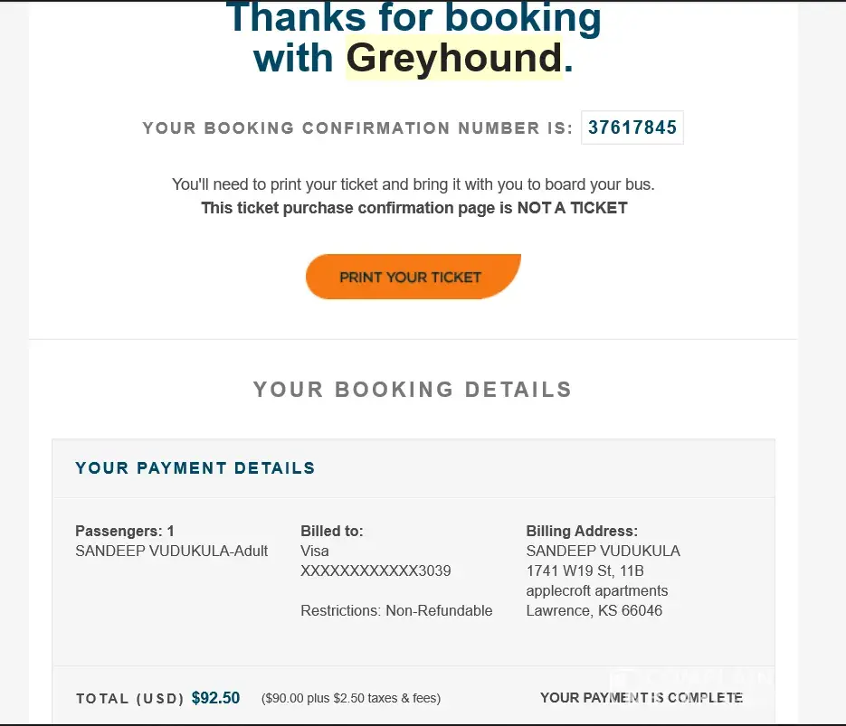 Dishonest checkout process. The total at the top of the page changes on you without an alert as you move down the page filling out inputs. Changed total does not show at bottom when you hit pay. My $14 ticket had a $18 "guest" fee. Change your checkout process Greyhound- feels like you robbed me.