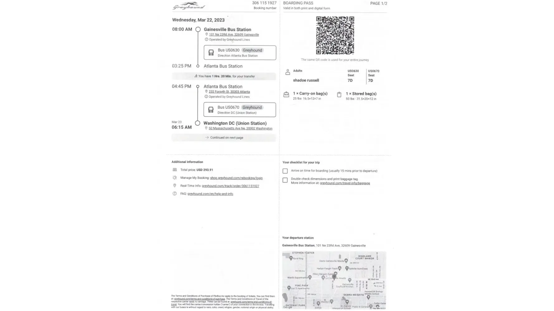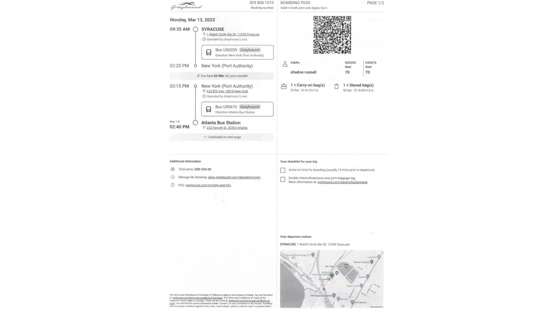 March 13 2023 I purchased a ticket number [protected] syracuse ny to gainesville florida for 254.20 paid for a seat 5.99 go to syracuse ny terminal no one behind the counter to check my bag and the machine that prints tickets was not working, so they scanned my paper i had printed from computer no problem on the bus to NYC for my next transfer got there waited in line showed her the rude bus driver my paper and she said it was no good what the hell so she didnt even bother to help me at all she took off with my luggage not tagged to the next stop, so now I am stranded at NYC just standing there in dis belief had to purchase another ticket home, also my returning ticket [protected] i purchased 293.91 i paid for to come back home. This is unexceptable! i want my refund for the two tickets and by all rights you should give me back the ticket money for the return home from NYC. Can't speak to a person have to fill out everything online my luggage is lost no tag i have no clothes and this is outrageous how you treat people, i will not be traveling greyhound bus lines i have used for many trips but this was the most terrible experience i have ever had.
