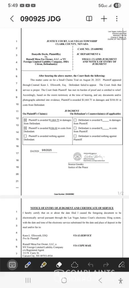 I am posting this factual account to protect future tenants and exercise my right to report on a matter of public safety. On August 20, 2025, the Las Vegas Justice Court ruled in my favor against Citron Apartments and Russell Mesa Fee Owner LLC in Case Number 25A000982 after finding the unit uninhabitable due to hazardous mold that endangered the health of my 14-year-old son. Upon moving into the unit on March 31, 2025, I discovered visible mold behind the master bathroom toilet and documented it on my signed check-in sheet on the very first day. On April 11, 2025, I dealt directly with Assistant Manager Sandra Gonzalez, sending a formal notice that I would be forced to hire my own independent experts since the office had failed to address the health hazard. Despite this notice, Sandra Gonzalez and Manager Ariana Malachi provided no assistance and did nothing to resolve the situation, dismissing the issue during a brief inspection. I subsequently hired Merry Maids and MI&T Environmental, whose professional lab results confirmed hazardous concentrations of Chaetomium and Penicillium/Aspergillus. These are recognized as some of the deadliest molds to humans.A judge reviewed this evidence and awarded me a judgment for damages. Despite this judicial order, the property is managed by Greystar and has refused to pay the judgment while actively reporting a debt of 3,388 dollars to credit bureaus. As of January 13, 2026, they verified this debt to TransUnion despite having a copy of the court order, which has forced me to file a formal Identity Theft and Fraudulent Reporting report with the FTC. Under Nevada NRS 41.660, I am protected in sharing this information as a matter of public interest and I have the physical evidence for everything stated above.