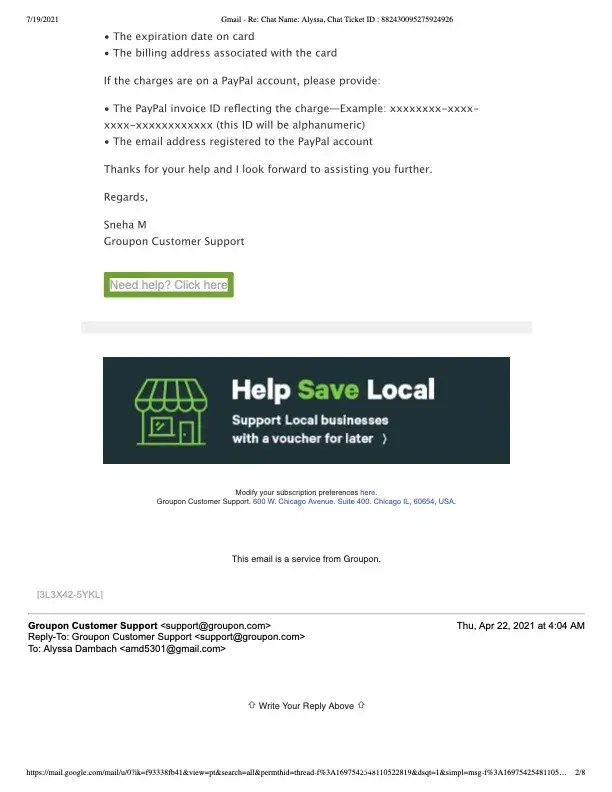 I reached out to Groupon about an issue with credit in my account disappearing. They asked for more info - credits numbers & expiration dates, etc., They responded with a very nasty threatening email stating "Upon review of your account, we have identified a violation of our Terms of Service. Because of this, we have closed your account and request that you discontinue use of our website and services immediately and note that we are preserving all rights to pursue further action—should it be necessary—to preserve the integrity of our program and the best interests of our company."