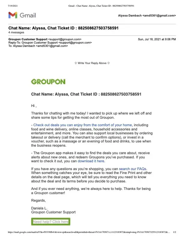 Desired outcome: Receive Groupon bucks refund