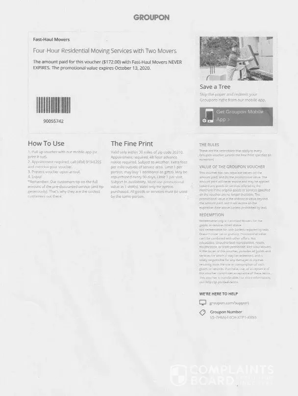 I purchased though groupon moving services but never received confirmation after several attempts to locate the voucher even thought funds were deducted from my banking account. Several weeks later I was told I had purchased this by logging in on face book and was emailed copy, when I did receive the voucher from them I contacted the moving service and wa...