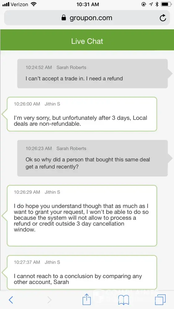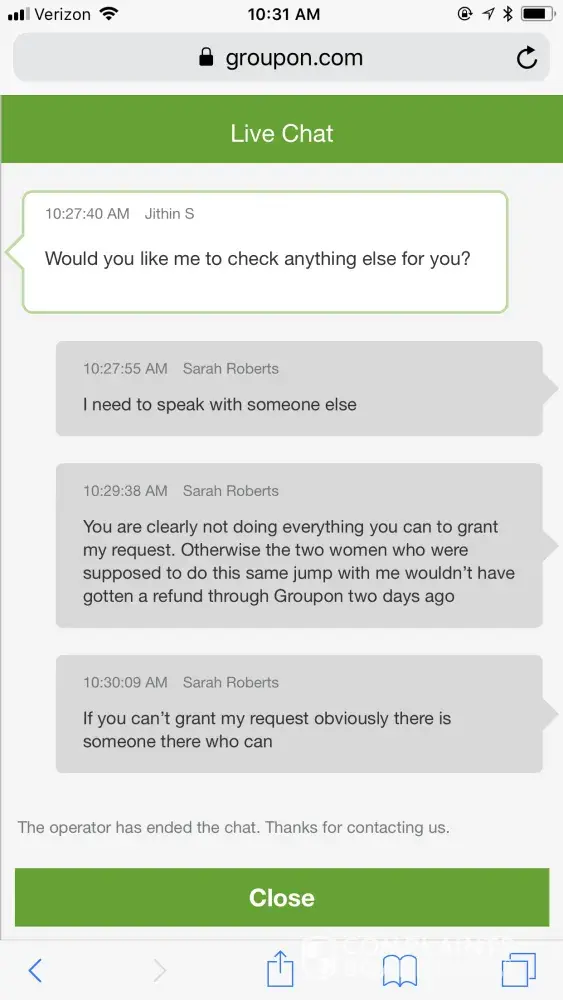 I spoke with Jithian S., a customer support representative, through your online messenger. I was looking for a refund for a service I was unable to use due to the merchants cancelations because of weather (sky diving experience). Jithian was of little help saying I was only eligible for Groupon credit in spite of my explaination that two of the same groupons had been refunded to two of the women I was jumping with over the past two days. She ended our chat. I later spoke to another representative who fulfilled my request once I provided confirmation of the cancelation. I wasn't even given that option with Jithian.