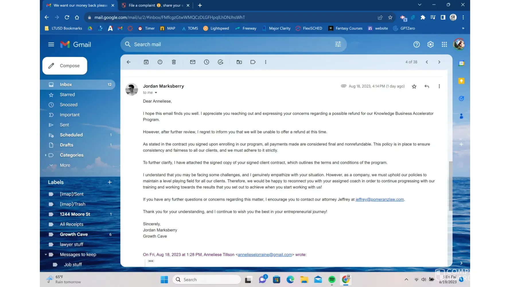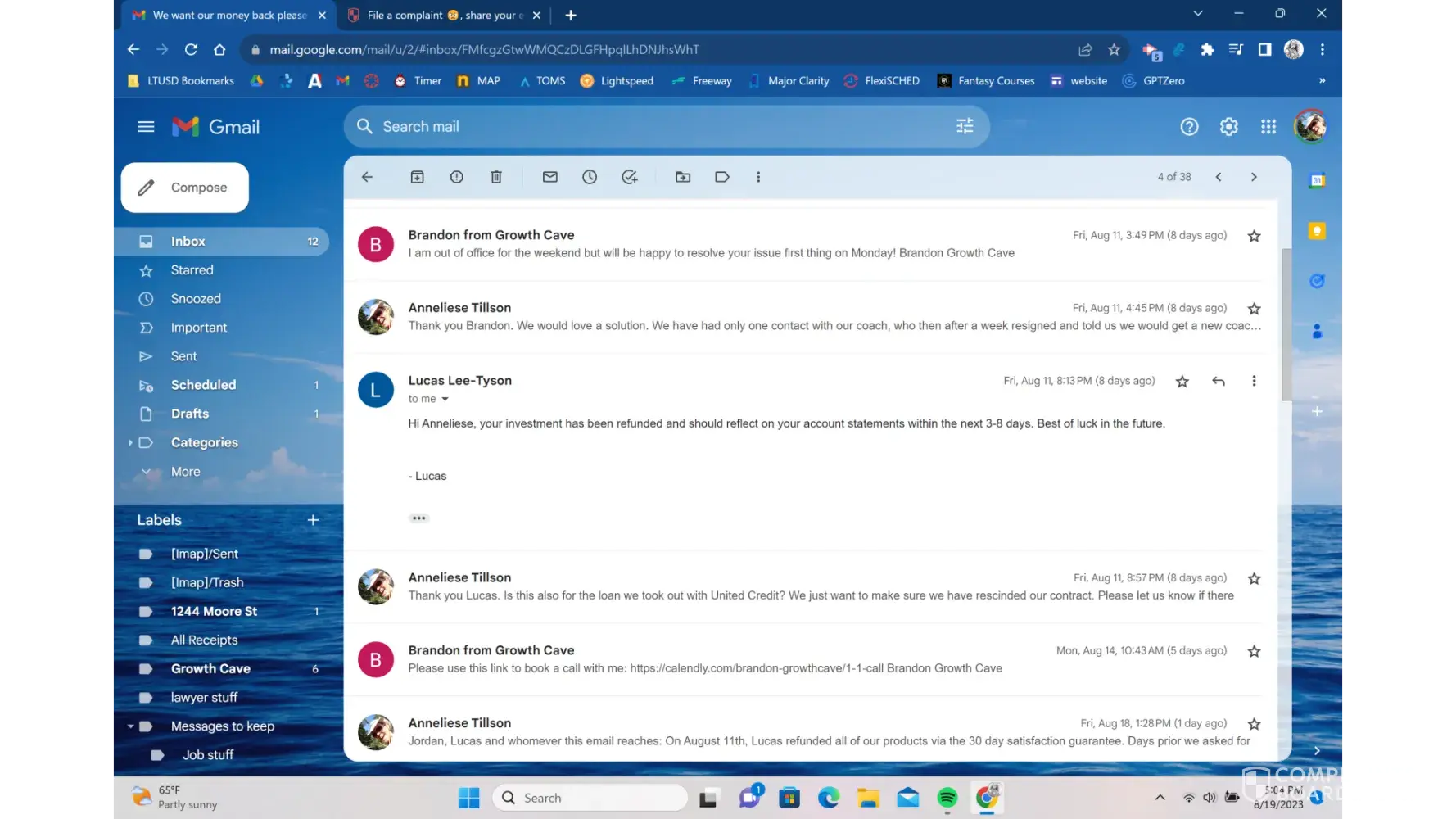 Growth Cave and Lucas Lee Tyson did not fulfill contract or 30 day money back guarantee