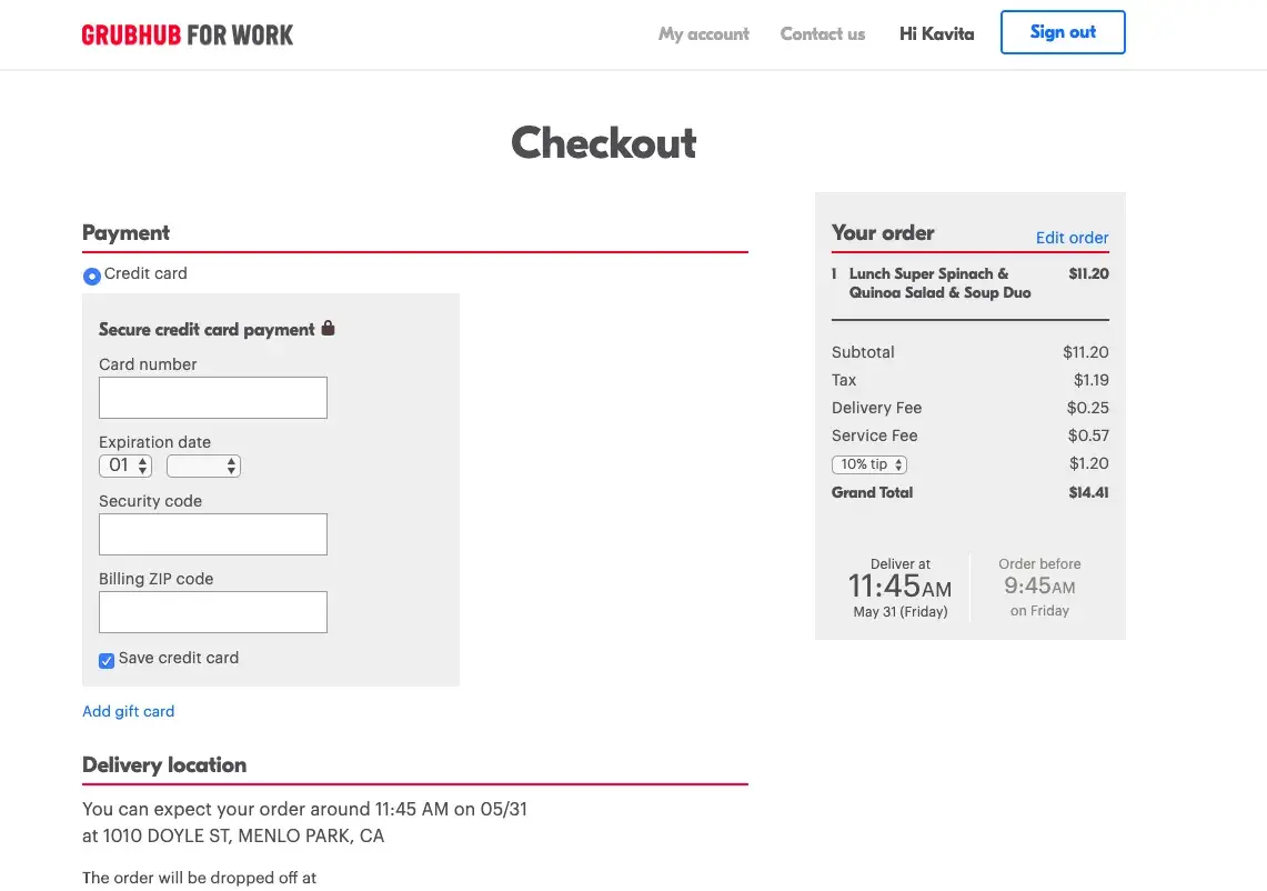 I'm an employee of Deserve, a company who uses grubhub services every friday for every employee. The company offers $18 worth free lunch for every employee. Every-time I log in to my account using deserve email address, it shows me the listed restaurants that company will be ordering from on Friday, but at the checkout its asks for my credit card information. We have been trying to fix this issue since 3 weeks but have gotten no luck. Can someone please FIX this issue?