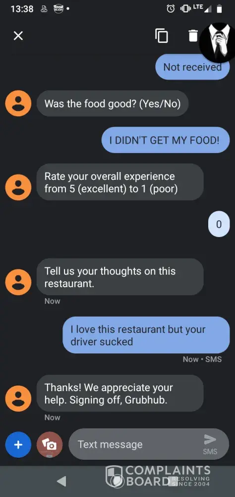 So today I order my lunch from a restaurant 10-15 minutes from the office I'm in. I get a text at 12:37 stating my order has been picked up and will be delivered between 12:55 and 1:05. I know they usually extend the delivery time I'm case of a detour or traffic issue, that's fine. At 12:40, I was outside the office for 5 minutes. When I went back in, I had a text from GrubHub about "we tried to reach you but your phone isn't working. Please call us. " So I call. When I give my name, first, he tells me he doesn't show any orders for me. I reiterate that I'm a customer. He says "I have you in our system as a driver." Well, yeah, can't I be both a driver and a customer? So he looks up my customer account. Tells me the driver was at my location and couldn't find me, so the order was marked as delivered and the driver left. How is this possible? Number 1, there was no way the driver got there that quickly. 2, I WAS OUTSIDE THE DOOR WHEN HE SUPPOSEDLY GOT THERE. even if I hadn't been, there are only 4 people in the office, common sense said one of us would have seen him. So he took my $20 order, and I still got charged. So, thanks, GrubHub, for losing me as a customer AND a driver, because I WILL NOT work for a company who tolerates this kind of bulls**t. I would never steal someone's food that they had to work hard to pay for. The only reason I used them was doordash was down and I was so hungry my stomach was eating itself. A**hole got a 20% tip from me, too.