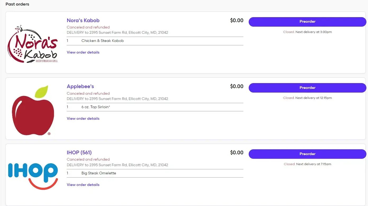 On the 7th of November, I tried to order food through my account with Grubhub and noticed my order were being cancelled after placing them.