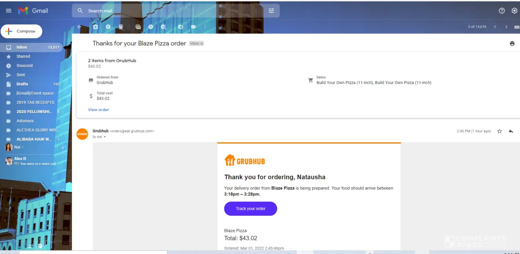 Hi, I ordered two pizzas today March 1, 2022 from Blaza Pizza through Grub Hub, and it showed delivered. I never received the food I spent 45.00 and paid delivery fees with no food. I call Grub hub and they said it will take 3-5 business days to refund my money. That was my last money, for food now I have to wait that is unacceptable