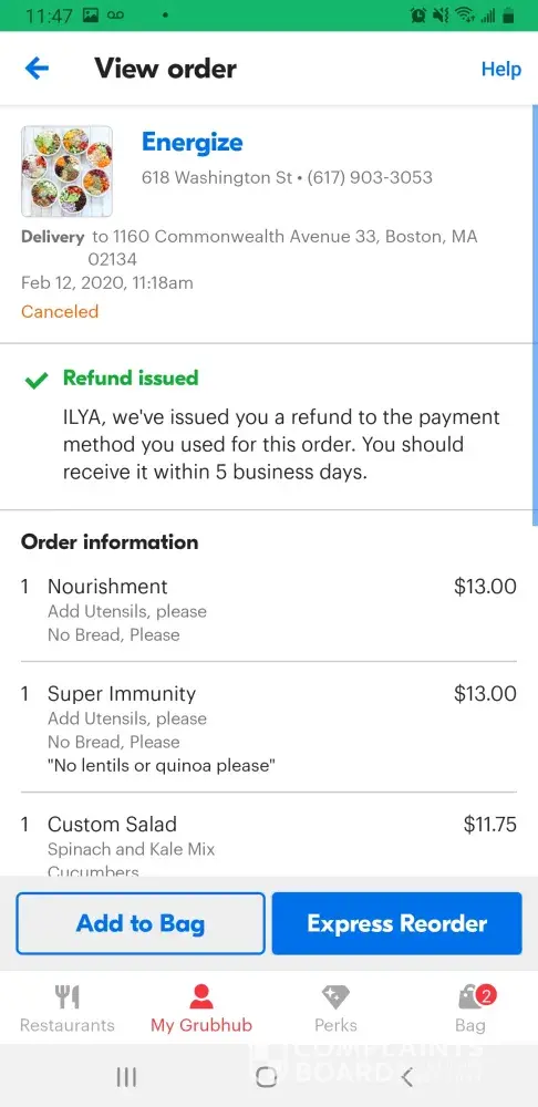 When I came to the restaurant they said they never received an notification from GrubHub. The restaurant owner told me how much problem they have with GrubHub passing on orders and they have had numerous complains. Going back into the account, GrubHub took my order, charged my account and then cancelled the order and refunded my account without any further notification either to me or the restaurant.