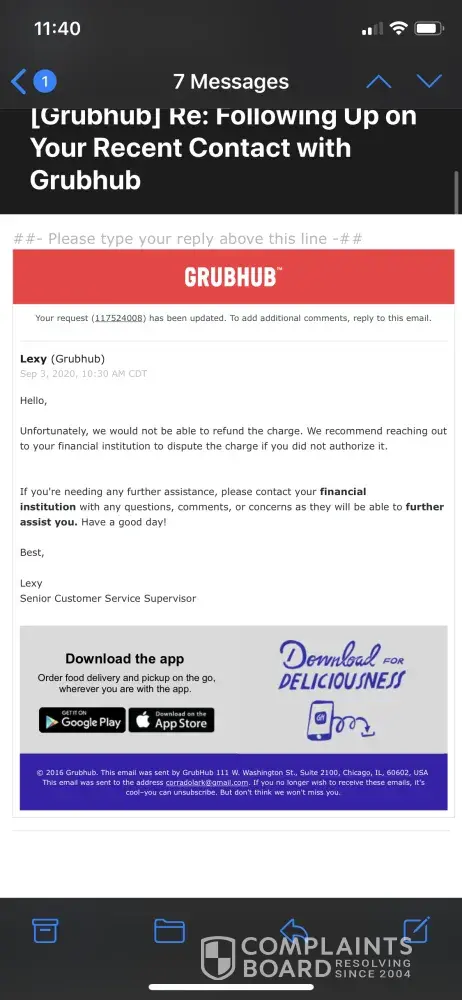 Hello, I haven't used grub hub in years, yet someone stole my credit card information and somehow hacked into the old account I had and ordered food I believe as a test run to see if they could get away with it. My credit card has already closed the card and is investigating while sending me a new card, but grub hub denied to cancel the order and said I ordered it, which I clearly did not since I don't live where they seemed to have delivered food on my expense. I'd like a full refund for whatever was charged, and my account fully closed and deleted since they cannot be trusted, at the very least. Thank you.