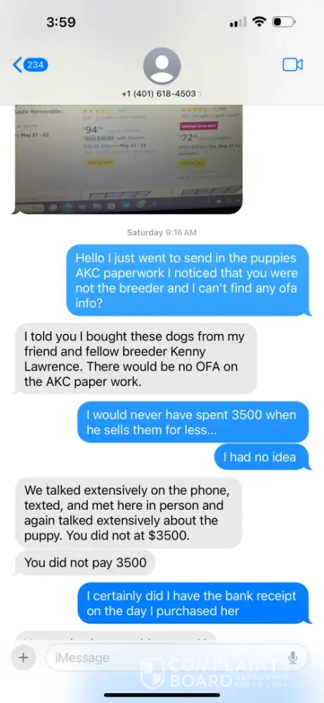 I have also been scammed by them 3500 she sold me someone else puppy although her website says she doesn’t work with other breeders the papers say the dog was bred by someone else.