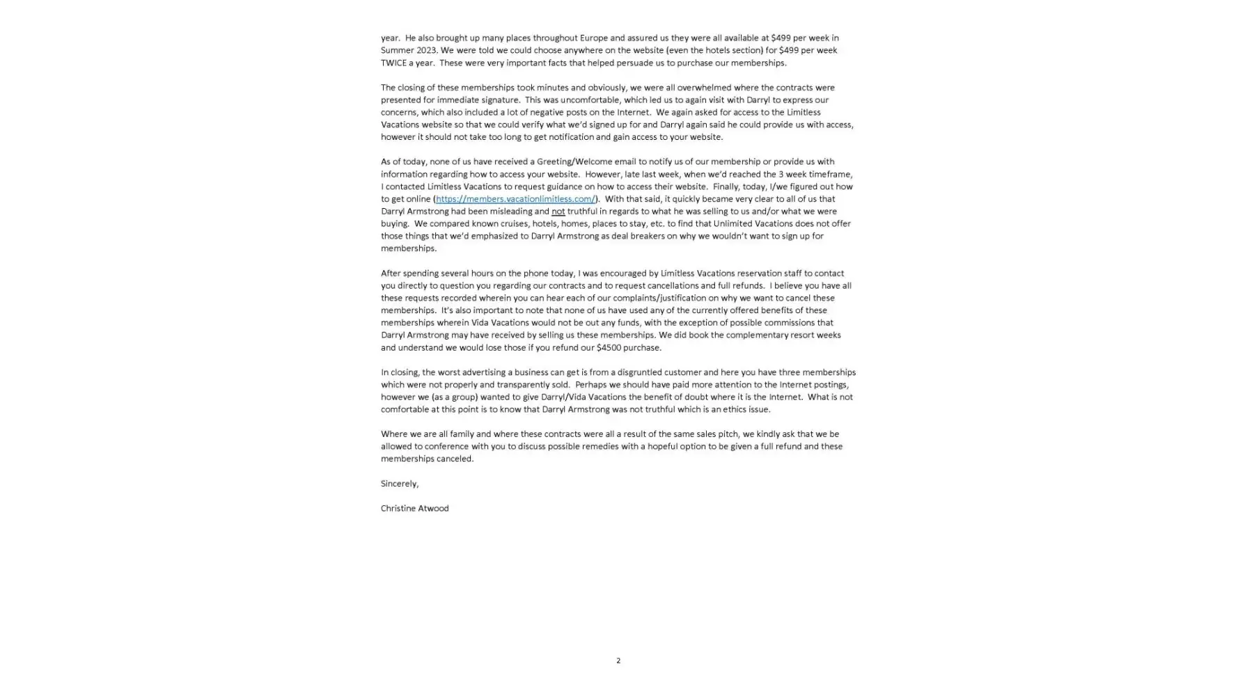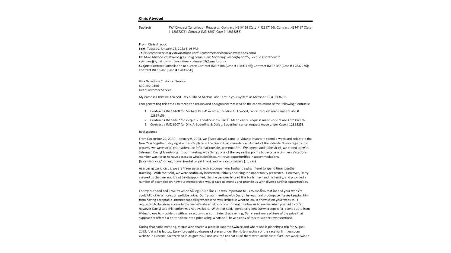 On 1/24/2023, we three contract holders all called into Vida Vacations per recommendation of Limitless Vacations and requested that our memberships all be cancelled. They indicated we'd be contacted within 48-72 hours which did not happen. Also, on 01/24/2023, I sent an email to [protected]@vidavacations.com to combine all three cases/contracts wherein we also requested that we be allowed to discuss this with Vida Vacations as a group. That email is pasted below.
