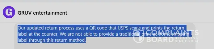 Per Gruv they are no longer providing return labels you can print yourself. According to them you have to take a QR code to the post office and have them print it. I am at work during the hours the post office is open. This is absurd. Completely unacceptable. I have tried working with "customer service." Who keeps making these decisions. I have a basic...