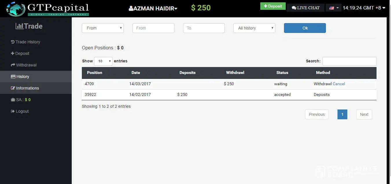GTP Capital have been trading with my money i invested $250.00 in Feb 2017 and since then i have not been able to withdraw or get my money back and for that reason i will advised every one not to invest in GTP Capital, Its Scam
