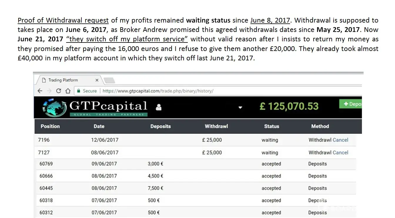 they promise withdrawal of £50, 000 last month Jun 6, 2017 but a broken promise, because this fraudster merchant GTPcapital uses my funds to trade without my permission, that made my account locked as broker explained, and then he ask me to pay 16, 000 euros to liquid my account, so he can process my withdrawal