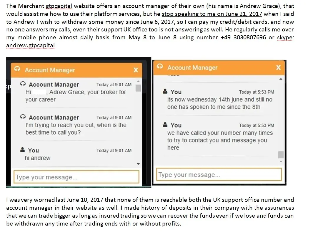 I have requested a withdrawal and now my account is blocked and all my calls is being ignored I have invested £25000 of money that I borrowed and now it seems like am left in debt with all this money to pay back dont know what to do gtp capital is very bad am stuck. Have been told that my trading manager witch in Alice Johnson is of with personal problems but no one else will help me they just ignore my calls and my email really don't know what to do because have invested all my money with this company and now nothing in return this is very sad for me don't even know how am going to get through.