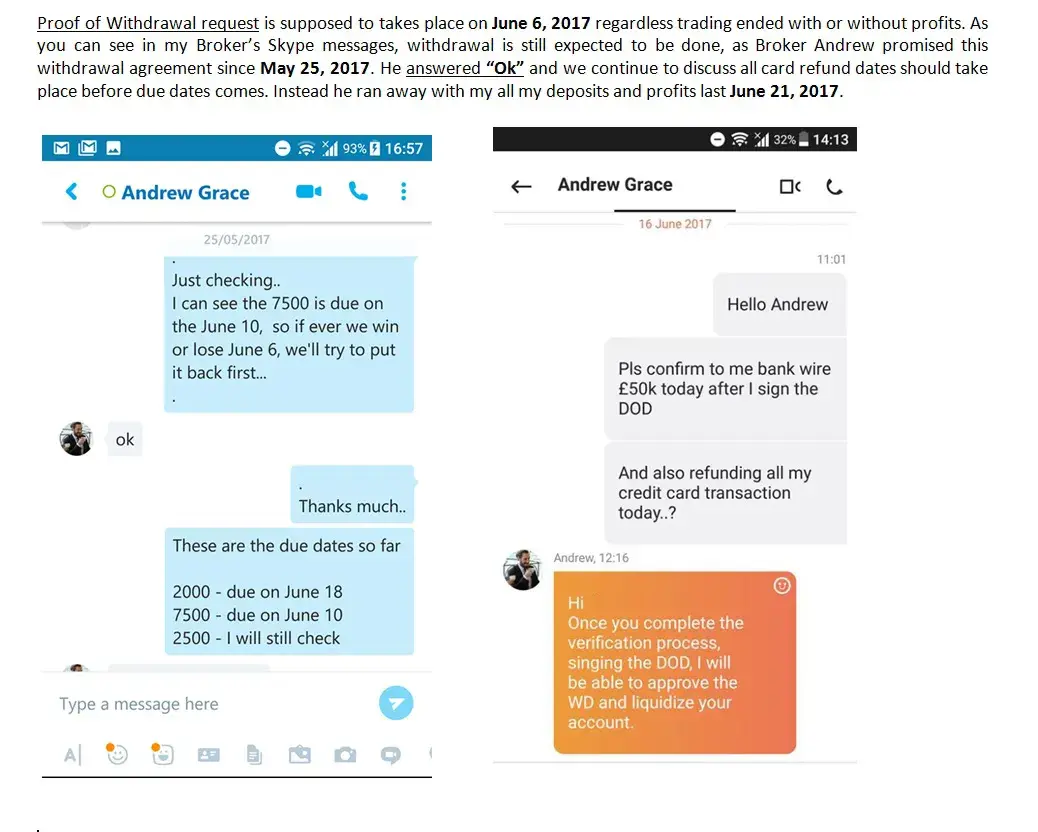 This complaint follows the pattern as mine only I am owed £12958.50 the only time they contact me is to ask for more money in order to make my account liquid andrew grace head of finance has asked for another £3650 to release my withdrawal still no contact about my withdrawal fca has advised legal action