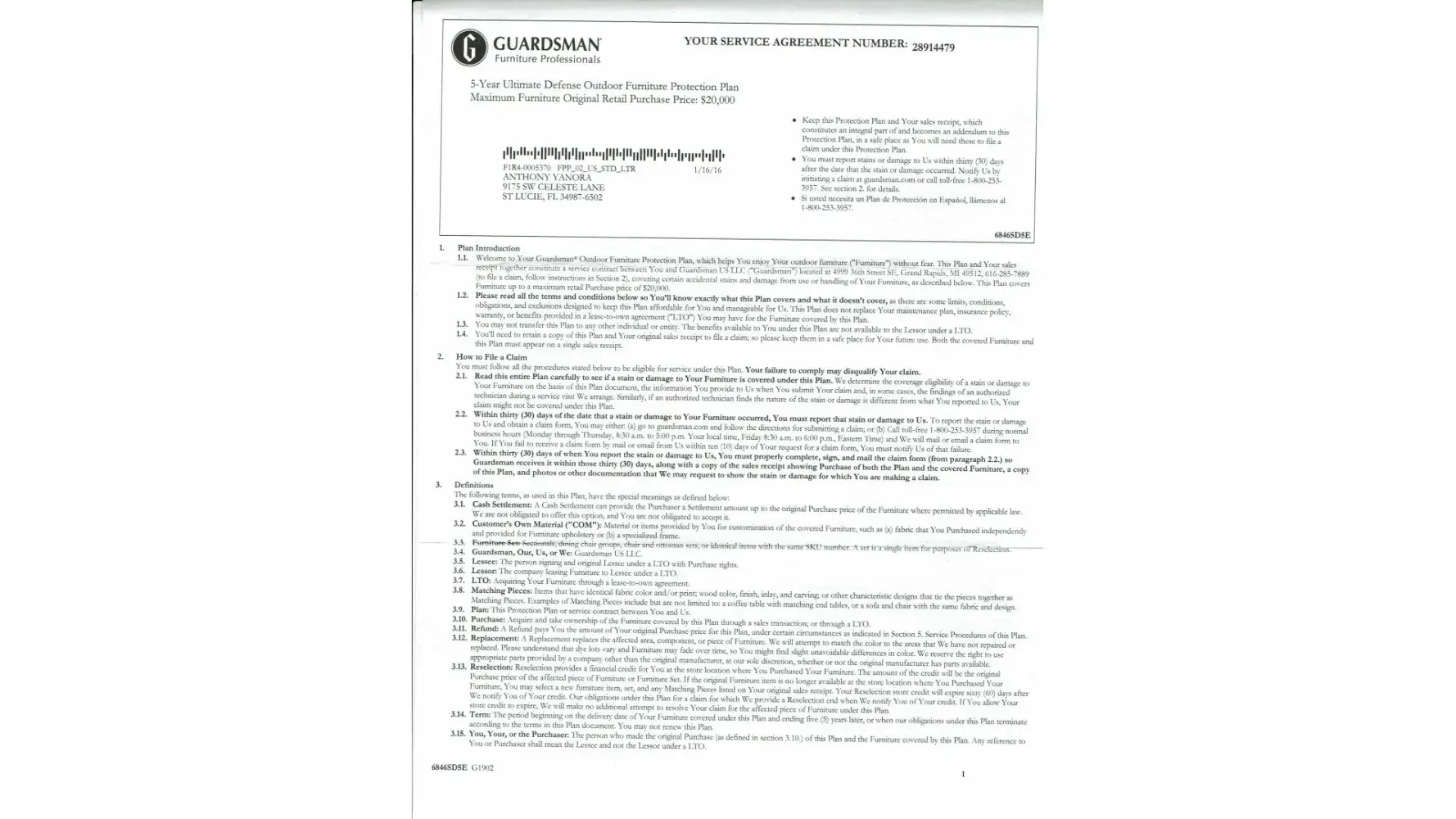 file the proper paperwork to get my sofa repaired or replaced. Was told by Guardian its not covered. I was scammed buying the protection. All i ask is give me the protection i paid for. Or give me the money i paid for the protection back. Please and Thank you.