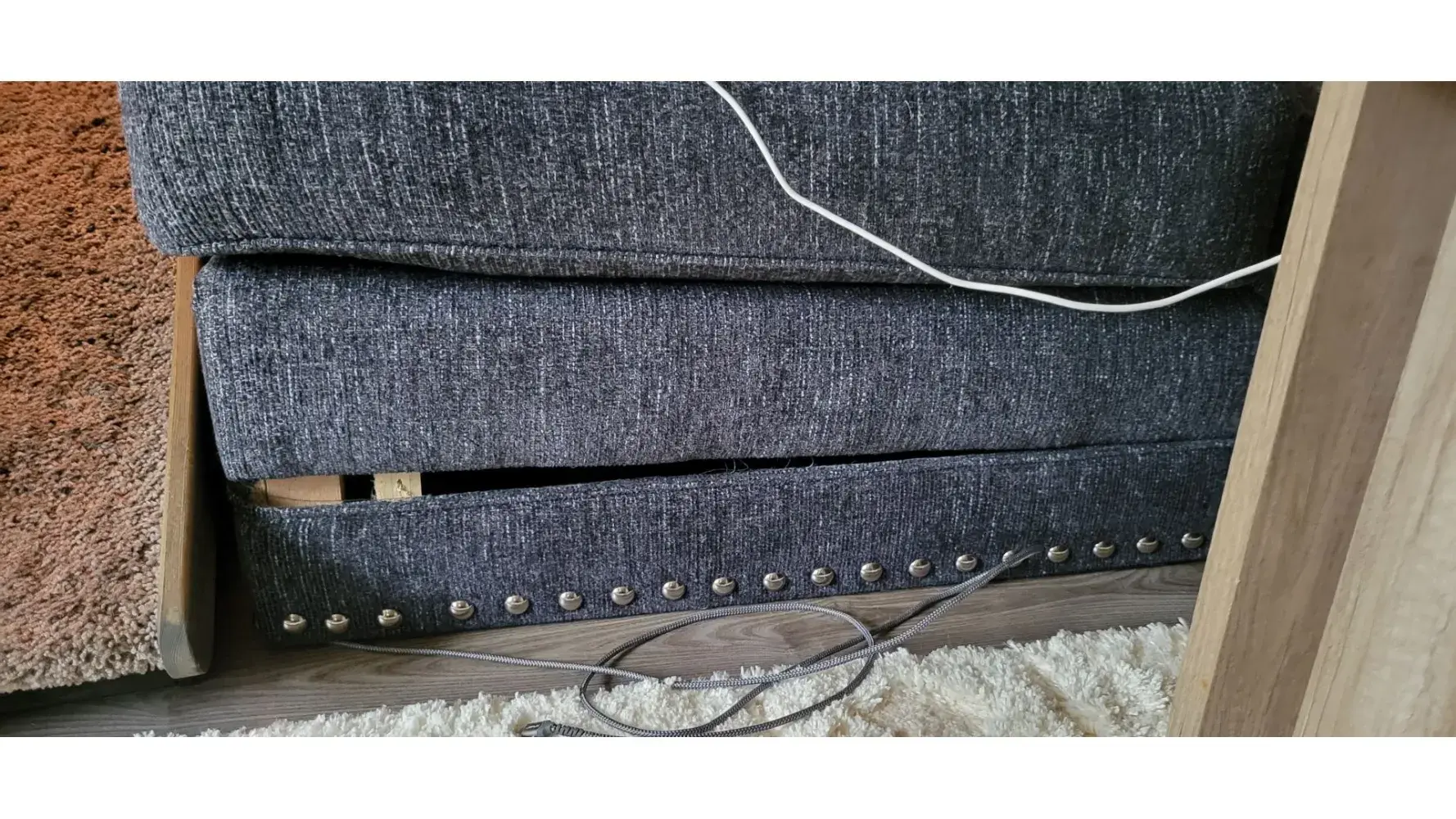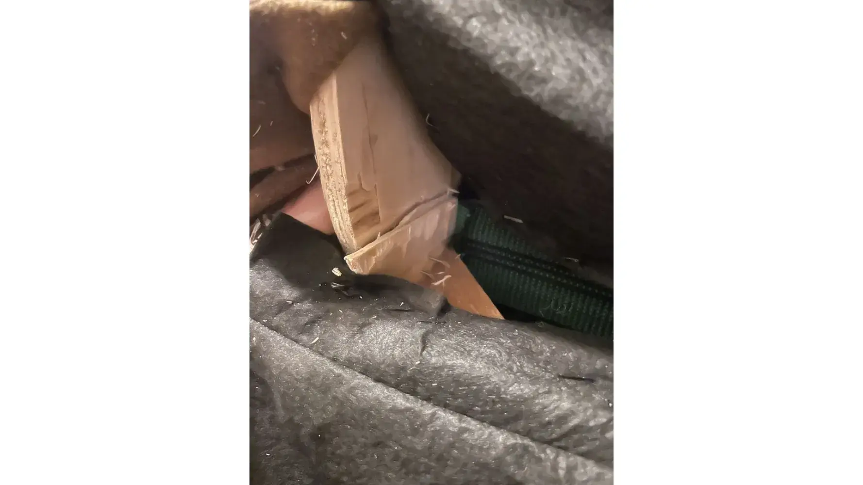 The sofa was moved away from the wall on 2/5/22. A 3" cut in the fabric was observed near the wood base A claim was filed with Guardian with copies of the receipt and pictures of the cut.