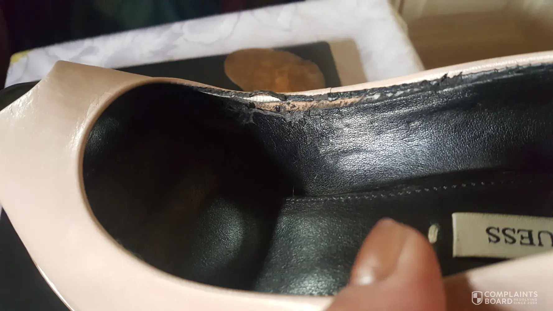 I purchased my guess shoe from citycenter shop Alexandria Egypt and I wore it only 3 times.. to my surprise this happened on my 3rd time all torn and marked black color all over my foot ..