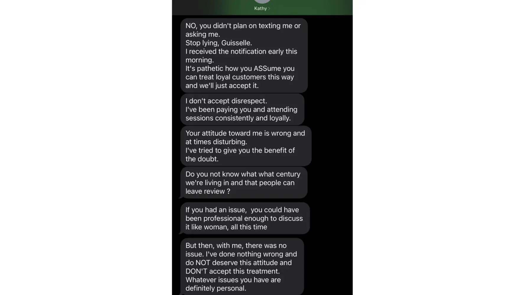 This person is a fake person writing a review. Her real name is Teresa Arasheben also goes by Terry or Kathy. She is a criminal and crazy. Be aware of her. She is harassing me over rescheduling her because i was sick. Has a lot of cases of harassment againt her.