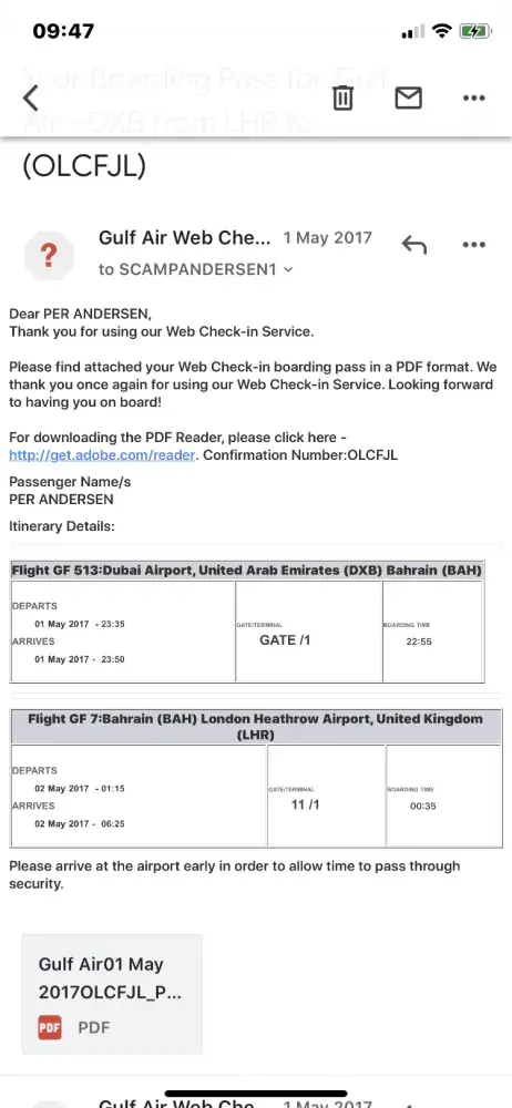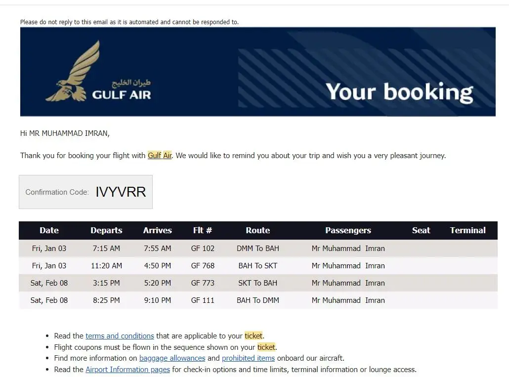 I have recently flown with Gulf air on Sunday 09 Jan from Karachi to London via Bahrain GF03