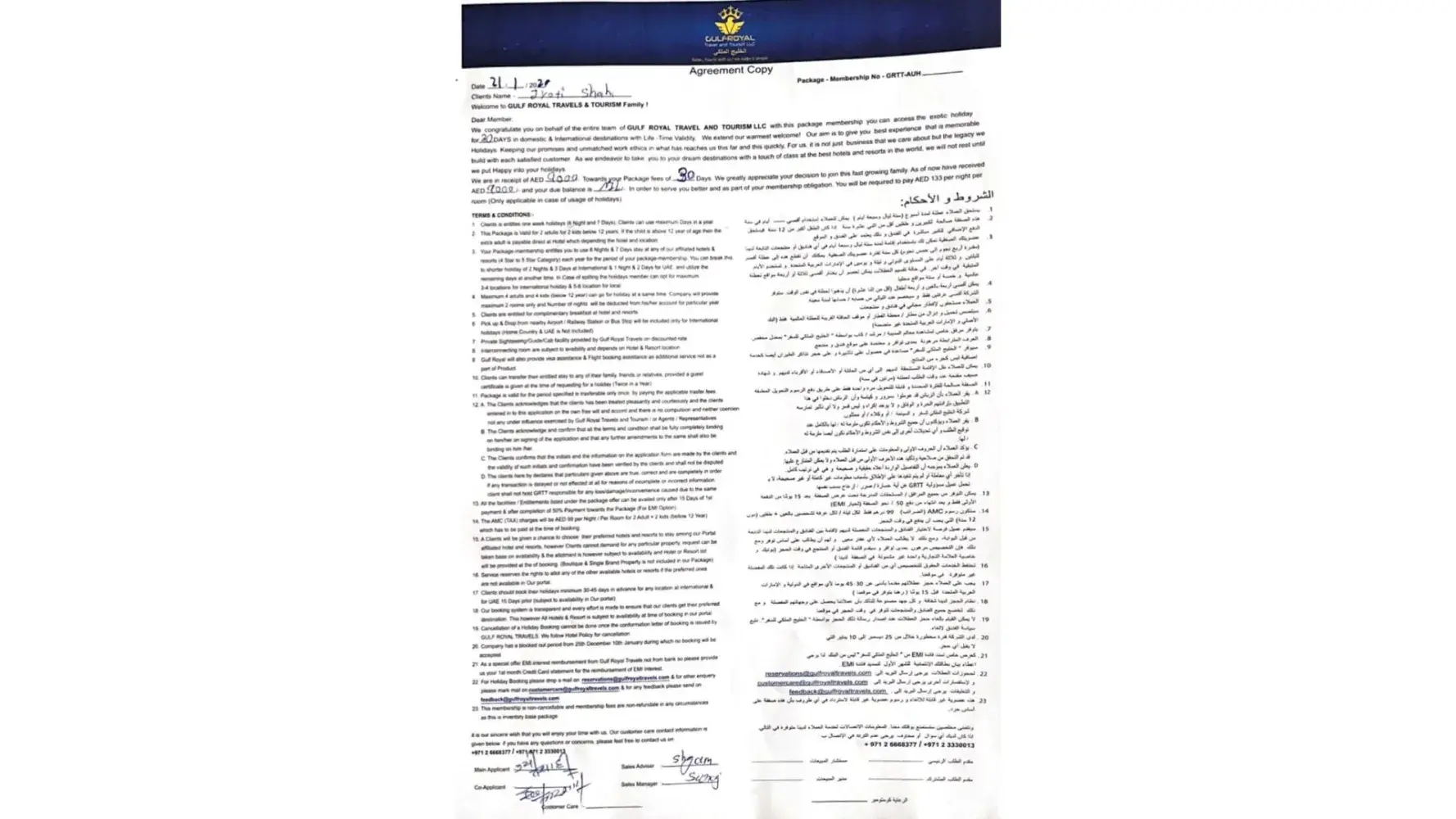 On January 30, 2023, my attempts to reach the Gulf Royal team for reservations proved futile. Their phone numbers and email addresses are inactive, leaving no means of communication. In 2018, they had invited me to Mariott Hotel Abu Dhabi for a travel package, where I purchased a 9000 AED package. However, they seem to have disappeared without a trace.
