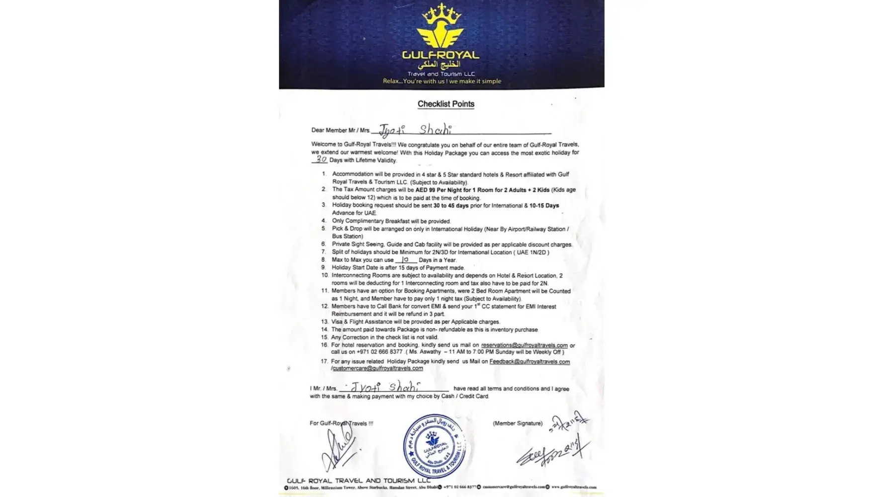 My parents unknowingly went to the meeting in Marriott hotel organized by Gulf royal travels. After all the false promises, my parents took the membership thinking it will be beneficial for their kids.