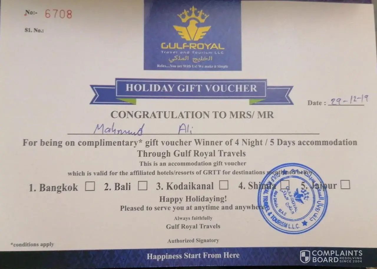 My name is A.P.Dinesh. I attended a Program conducted at Marriott hotel in Abu dhabi , next to Al Wahda mall by Gulf royals Travel and Tourism. We took a holiday package , date of issue 30/01/2019 , 35 days package for AED 10, 000/- We did the payment with ADCB bank and was told that the interest would be paid back. Some gift offers were also promised. Have been trying to reach them since then. Since two years there is no response to calls or mails.