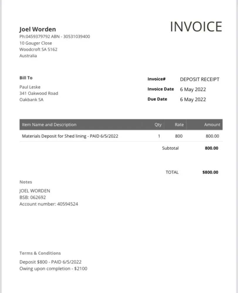 We answered a job add from Joel Worden via Gumtree to complete some plaster work at our house. (invoice attached). He met us at site and confirmed he would be able to do the job. We paid him a deposit of $890 (attached) and arranged a time for him to complete the work. He never showed and continued to messed us around for over 2 weeks before Joel txt us to say he wouldn't be able to do the work. It has now been 3 weeks and Joel has not refunded us our deposit of $890. He has told me numerous times he would pay us by a certain date and the money never got refunded. He now won't reply to my txt messages which makes me believe he isn't planning to refund us the money. He has since taken his add down from Gumtree. Regards Amelia