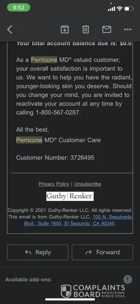 We found clear and detailed contact information for Guthy-Renker. The company provides a physical address, 3 phone numbers, and 2 emails, as well as 4 social media accounts. This demonstrates a commitment to customer service and transparency, which is a positive sign for building trust with customers.