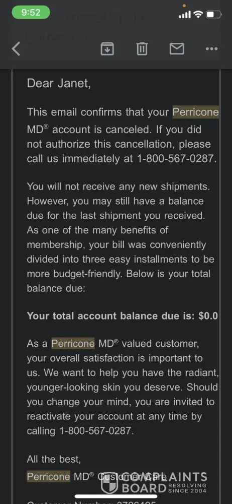I ordered some ProActiv+ supplies for my daughter in September, and paid for the first shipment. I then sent this email on September 19th after I had tried to reach Customer Service by telephone several times: "Hello there, I do not wish to receive an order every month; I would like to order on demand. I have tried to reach you via phone but the circuits are always busy. Please change my order ASAP and email me confirmation of this change." No response. In October, I received a "Past Due Notice" for a shipment that has not been sent or received (nor paid for, as they do not have my current credit card number). I wrote to the company informing them that they no longer had authorization for my VISA and that I was unhappy with the product and the customer service . Today I received another email now saying my account was two months past due. I have not received any product. I never wish to. I will never order again! But I would like them to stop mailing me "Past Due" notices. That would be much appreciated. Thank you very much.