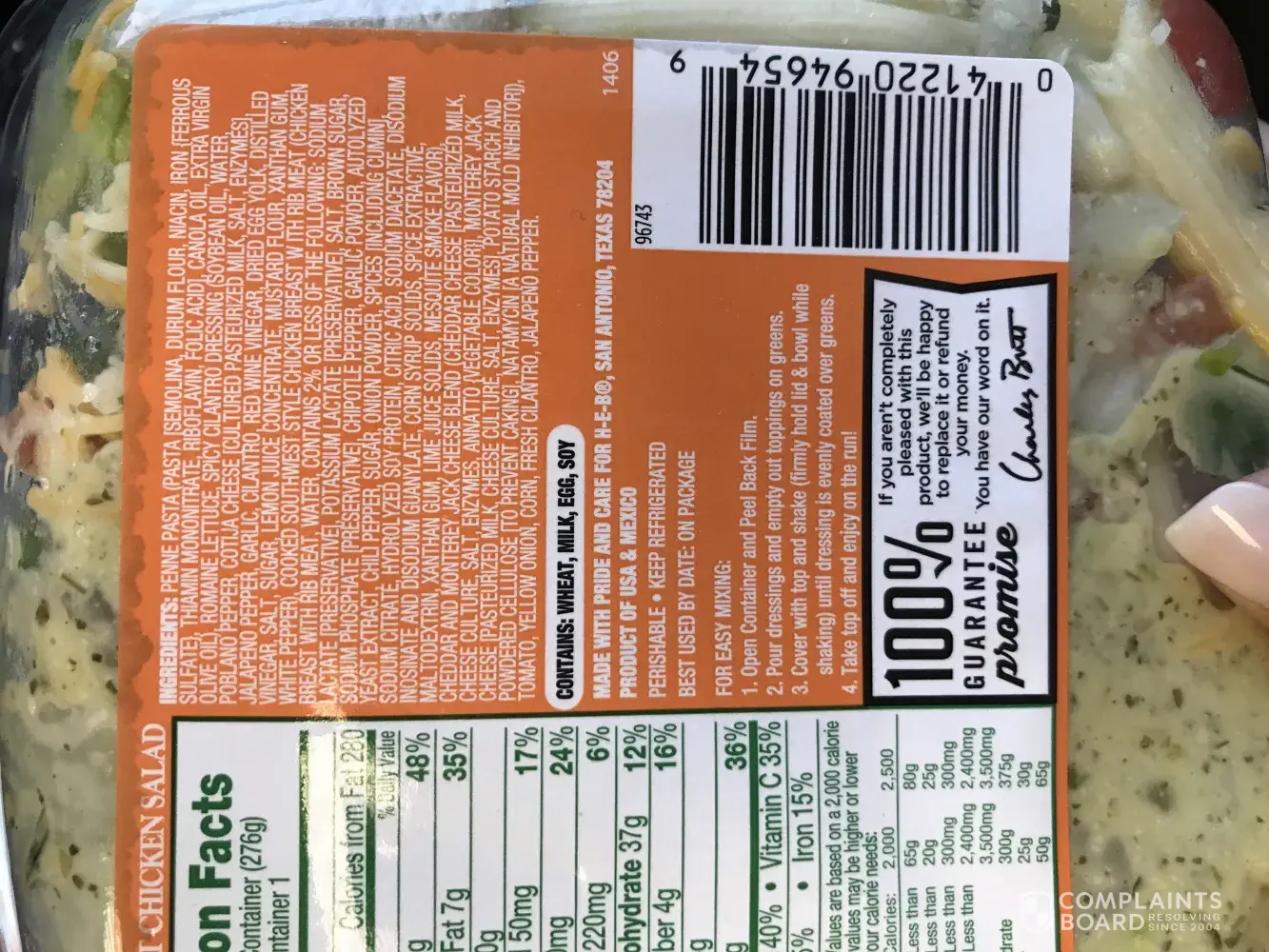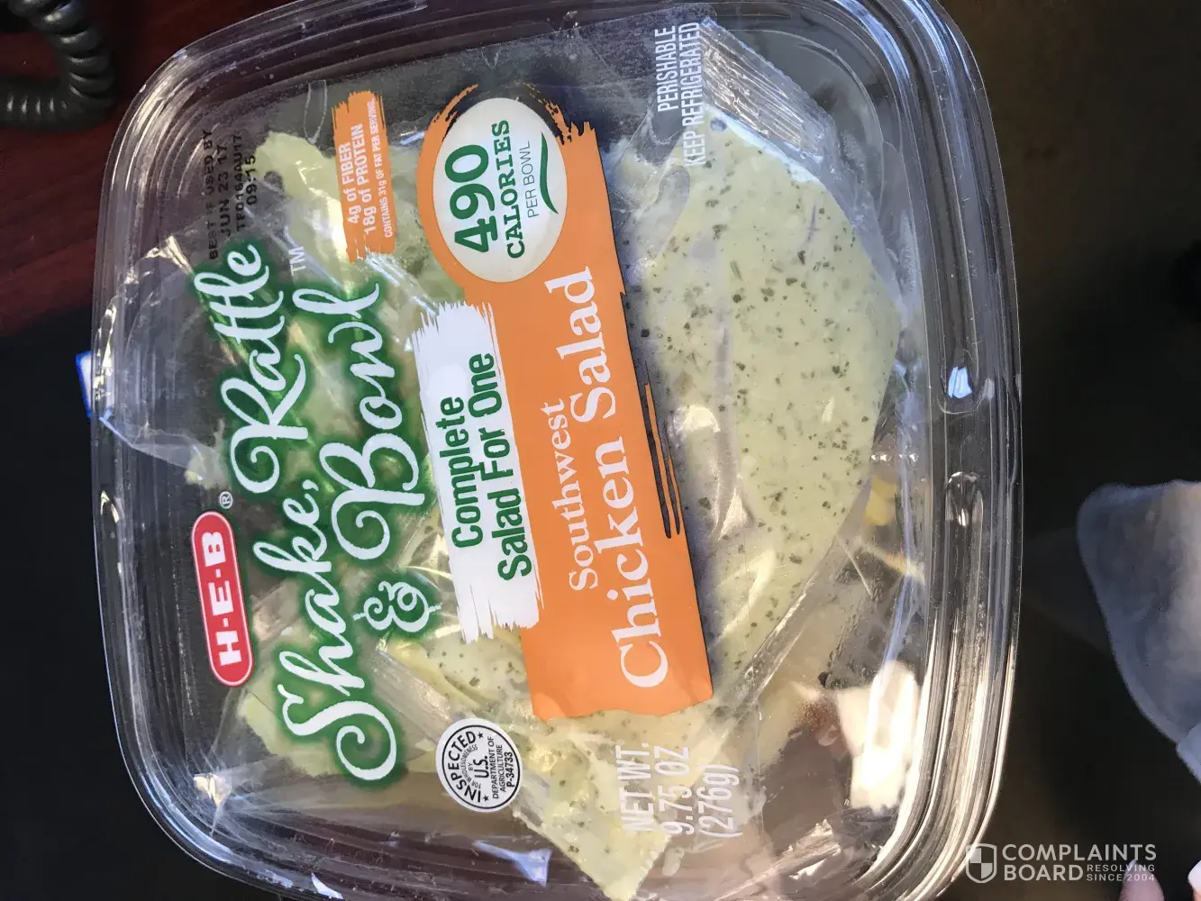 As I was eating this salad, I noticed a dead ant (quite large) in the bowl. Luckily I looked down before putting this bite in my mouth. That means the hygiene and sanitary conditions this was prepared in are less than adequate and is concerning for any HEB branded product. I buy 5 of these salads a week. Needless to say I won't be anymore. Let alone any other item that was prepared in store.