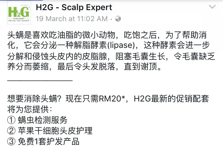 å½“ä½ åŽ»åˆ°çš„æ—¶å€™ä¼šæœ‰äººconsultä½ ï¼Œç„¶åŽæ£€æµ‹ä½ 的头皮 è¿‡åŽæœ€å“åˆ°çš„æ˜¯å¥¹ä¼šè¯´ä½ å¤´çš®æœ‰èž¨è™«è¿˜ç»™ä½ çœ‹é‚£æ¡è™«æœ‰å¤šä¹ˆæ´»è·ƒ 毛å”å µå¡ž 没关系 👉ðŸ»ðŸ‘‰ðŸ»ðŸ‘‰ðŸ»é‡ç‚¹æ˜¯ä½ voucher 里的两个护ç†éƒ½ä¸é€‚åˆç”¨ðŸ˜¡ 她会说 è‹¹æžœæŠ¤ç†æ˜¯çŒè¾“vitamin åŽ»å‘æ ¹ 会让螨虫长得更多 ç„¶åŽå¥¹ä¼šä»‹ç»ä½ 比较贵的é…套..最便宜的å¦ç”Ÿé…套都è¦688… è¿˜å¥½æˆ‘ææ—©é—®äº†å¥¹ä»¬ä¼šä¸ä¼šå¼ºåˆ¶æ€§æŽ¨é”€å¥¹ä»¬é…套 我很清楚的告诉她们说我是å¦ç”Ÿä¼šè´Ÿæ‹…ä¸èµ·ï¼å¥¹ä»¬ä¹Ÿåªæ˜¯å‘Šè¯‰æˆ‘的头皮状况 和她们的é…套 ï¼ æœ€åŽå¥¹ä»¬éƒ½è¯´åˆ°è¿™æ ·äº†ï¼Œæˆ‘就放弃åšä»»ä½•护ç†äº†â€¼ï¸â€¼ï¸â€¼ï¸â€¼ï¸â€¼ï¸â€¼ï¸