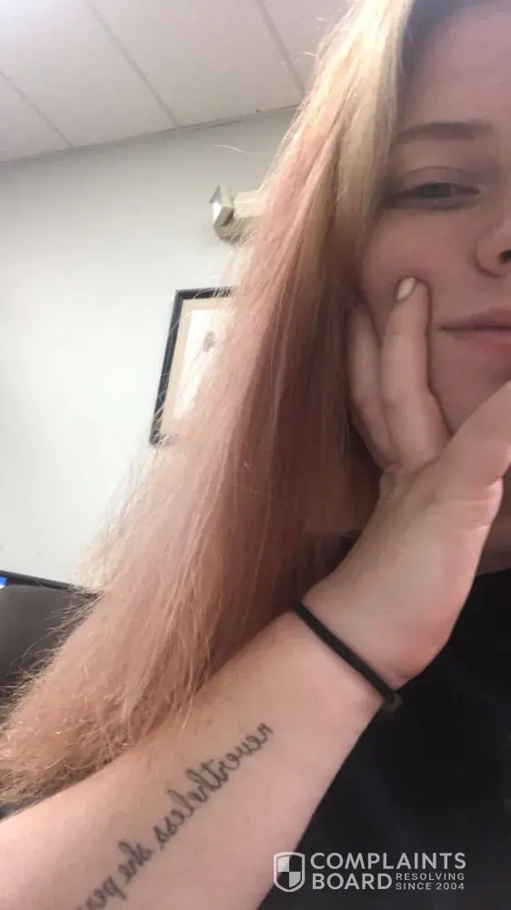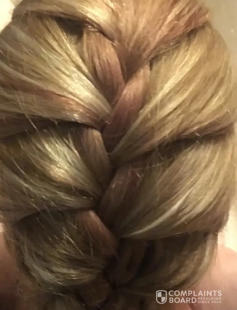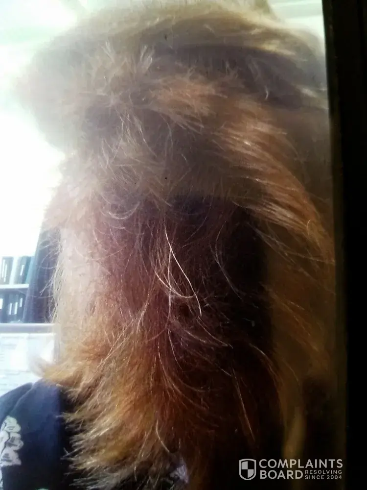 In Dec. I asked a woman at the 02155 location to lighten my hair from a dark purple to light brown. She used two rounds of color remover and a brown dye. She burnt my scalp so bad that I was scanning for months and the job she did left a permanent red dot in the back of my hair. I tried to go it out to no avail. I am not trying to go blonde and my hairdresser at Hair Affair by Janice cannot get this dog out at all. I spent five hours in a chair today trying to fix the the problem she did with no luck. While in the chair at Hair Cuttery I also complained of my scalp burning from the dye and she stated that it was normal. I spent over 8 hours in that chair that day for a notch job that months later is still hard to fix. Not only was this job botched I spent almost $400 to completely damage my hair. Attached is a photo of me two rounds of color remover and bleach later. It's so bad that I have to go back next week to try and get the rest out