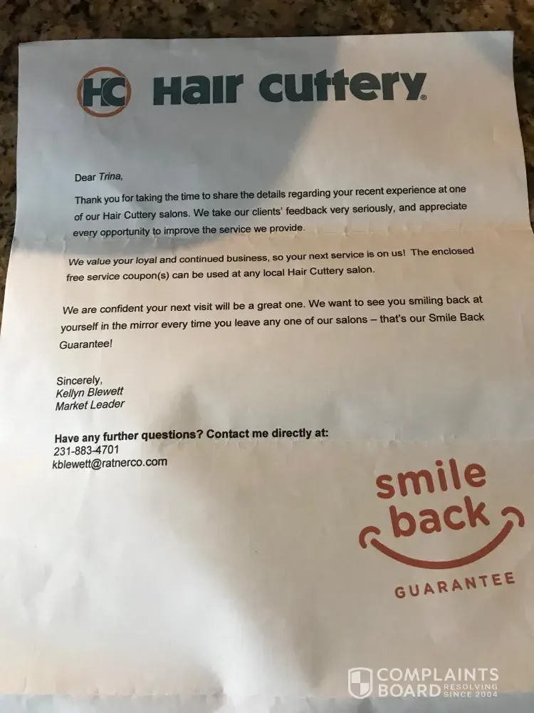 I asked to speak to a manager and she allowed us to use the coupon at no additional charge, however, the damage was already done. I reached to the district manger for this hair cuttery and she sent me an apologetic letter along with two more coupons for the same service which is not compensation for the lifelong damage it has done. Seeking therapy for both me and my grand-daughter for we have been both been traumatized by the incident.