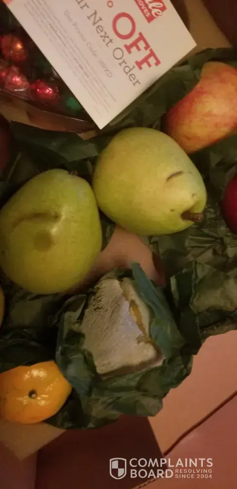 I received a gift of fruit and other items on Dec 12. The oranges were completely green with mold. At first I didn't realize what they were. The pears were bruised and had small cuts in them. I had never heard of Halegroves but my niece had sent them. I didn't want to tell her how bad it was so I contacted customer service. I was told a replacement would be sent but could not be sent until after Christmas which seemed strange to me. They also asked me to send them pics of the fruit via email which I did. No response and no fruit. The woman I spoke with said this never happens. REALLY? I'm the only one? I would suggest NEVER using this company. They really don't care what they send out